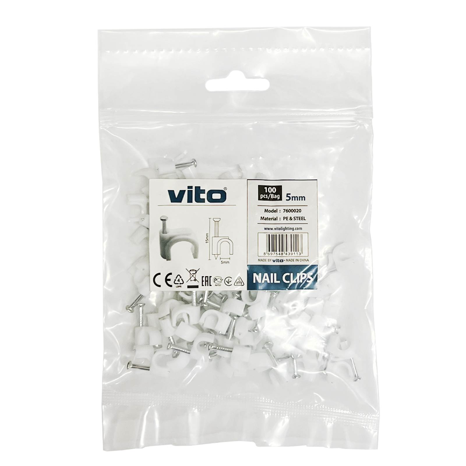 Plastica PE stabilizzata di alta qualità e chiodi in acciaio zincato. È possibile utilizzare i fermacavi con chiodo all'interno e all'esterno e avere un buon isolamento, resistenza alla corrosione e all'invecchiamento