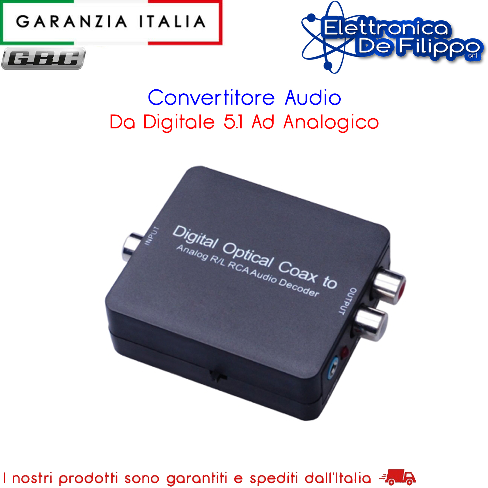Converte segnali audio stereo digitali 5.1 DTS e Dolby in ingresso (Toslink o Coax RCA) in segnali audio analogici RCA L/R e 3,5mm stereo jack in uscita; ideale per periferiche di ultima generazione (TV 4K e SetTopBox). Supporta frequenza di campionamento a 32, 44.1, 48 e 96 KHz. Perfetto per l’ascolto in cuffia dell’audio dei televisori di ultima generazione dotati di sola uscita digitale. Il convertitore è di dimensioni ridotte. Alimentatore incluso.