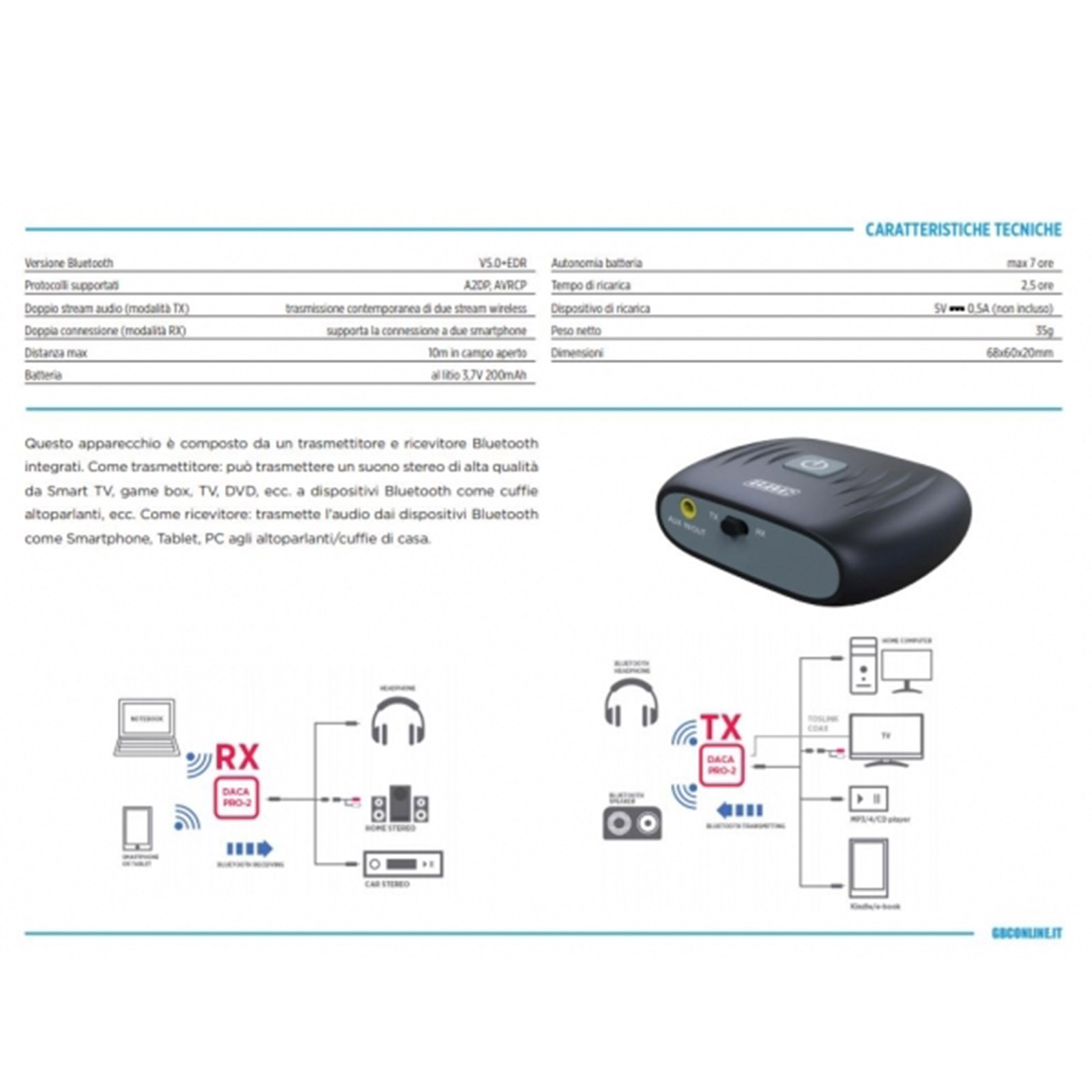 Convertitore bidirezionale di segnali audio stereo digitali in ingresso (Toslink o Coax RCA) a segnali Bluetooth permettendo una trasmissione/ricezione senza fili, infatti se collegato a degli speaker permette di ricevere da fonti bluetooth e riprodurre il segnale audio. Ideale per collegare delle cuffie bluetooth alla TV e trasmettere l’audio senza l’ingombro di fili ad una distanza massima di 10m; la batteria ricaricabile da 3,7V (200 mAh) con un'autonomia fino a 7 ore, lo rende un oggetto ideale anche da viaggio; cavo per la ricarica incluso (Alimentatore non incluso). Versione Bluetooth: V5.0+EDR, Protocolli supportati: A2DP, AVRCP.
