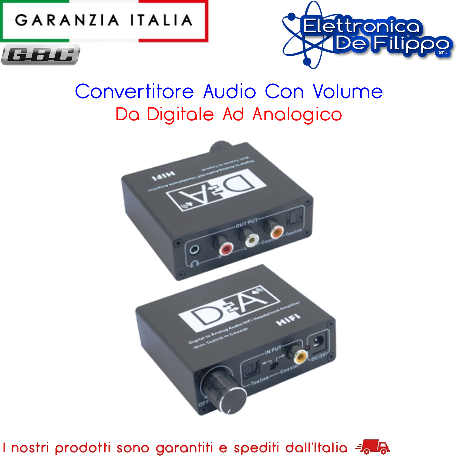 Converte segnali audio stereo digitali in ingresso (Toslink o Coax RCA) in segnali audio analogici RCA L/R e 3,5mm stereo jack AMPLIFICATA in uscita con regolatore di VOLUME e possibilita' di conversione bidirezionale Toslink/Coassiale. Supporta frequenza di campionamento a 32, 44.1, 48, 96 e 192Khz. Perfetto per l’ascolto in cuffia dell’audio con la regolazione del volume dai televisori di ultima generazione dotati di sola uscita digitale. Amplificazione 200mW x 2CH a 16Ω e 20mW x 2CH a 300Ω. Il convertitore è di dimensioni ridotte. Alimentatore incluso.