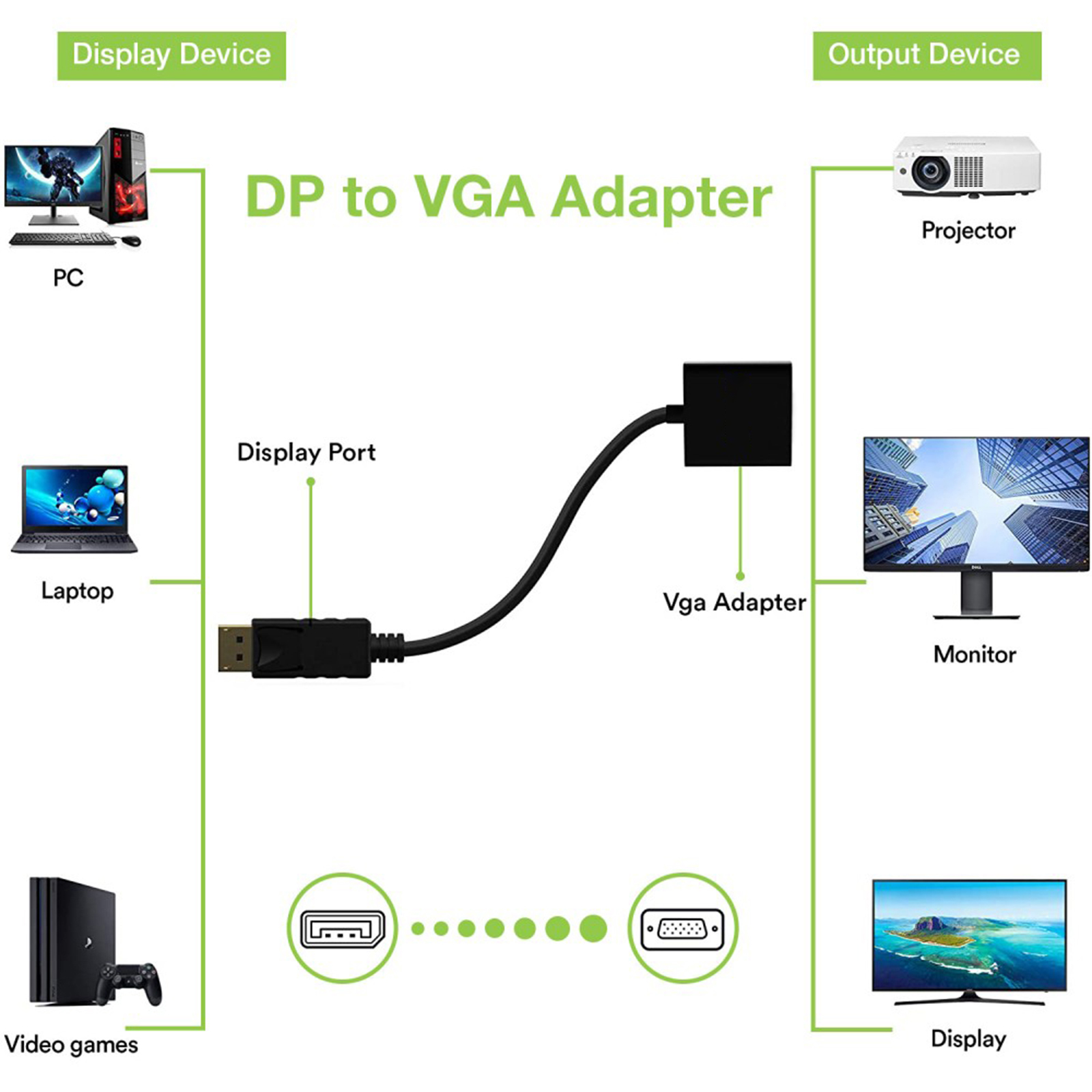 Permette di convertire un segnale Displayport, in un segnale VGA e collegare PC dotati con DP a monitor HDMI. Supporta risolzuioni massime 2048 x 1536, Banda 10,2Gbps. Non necessita di alimentazione, cavetto 15cm