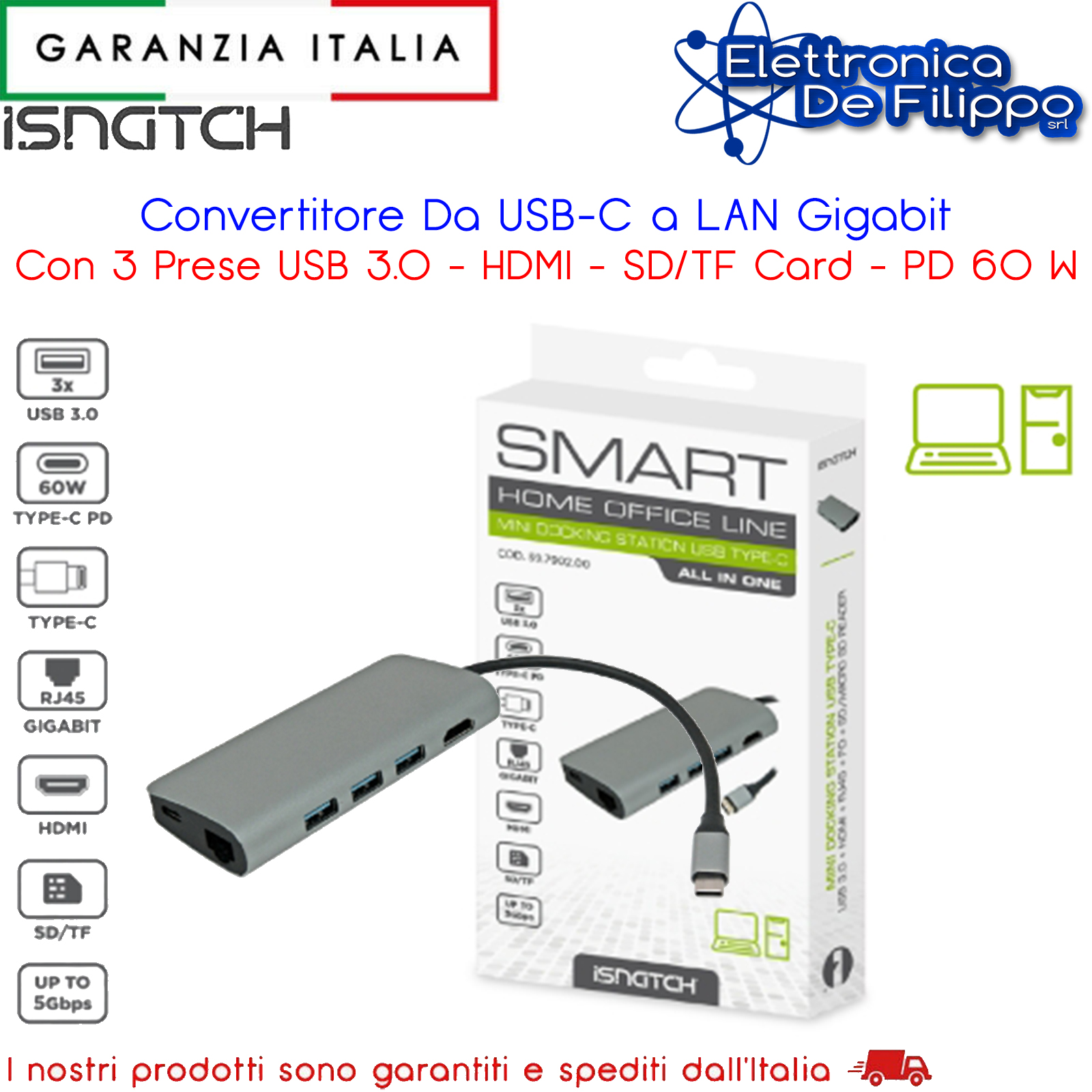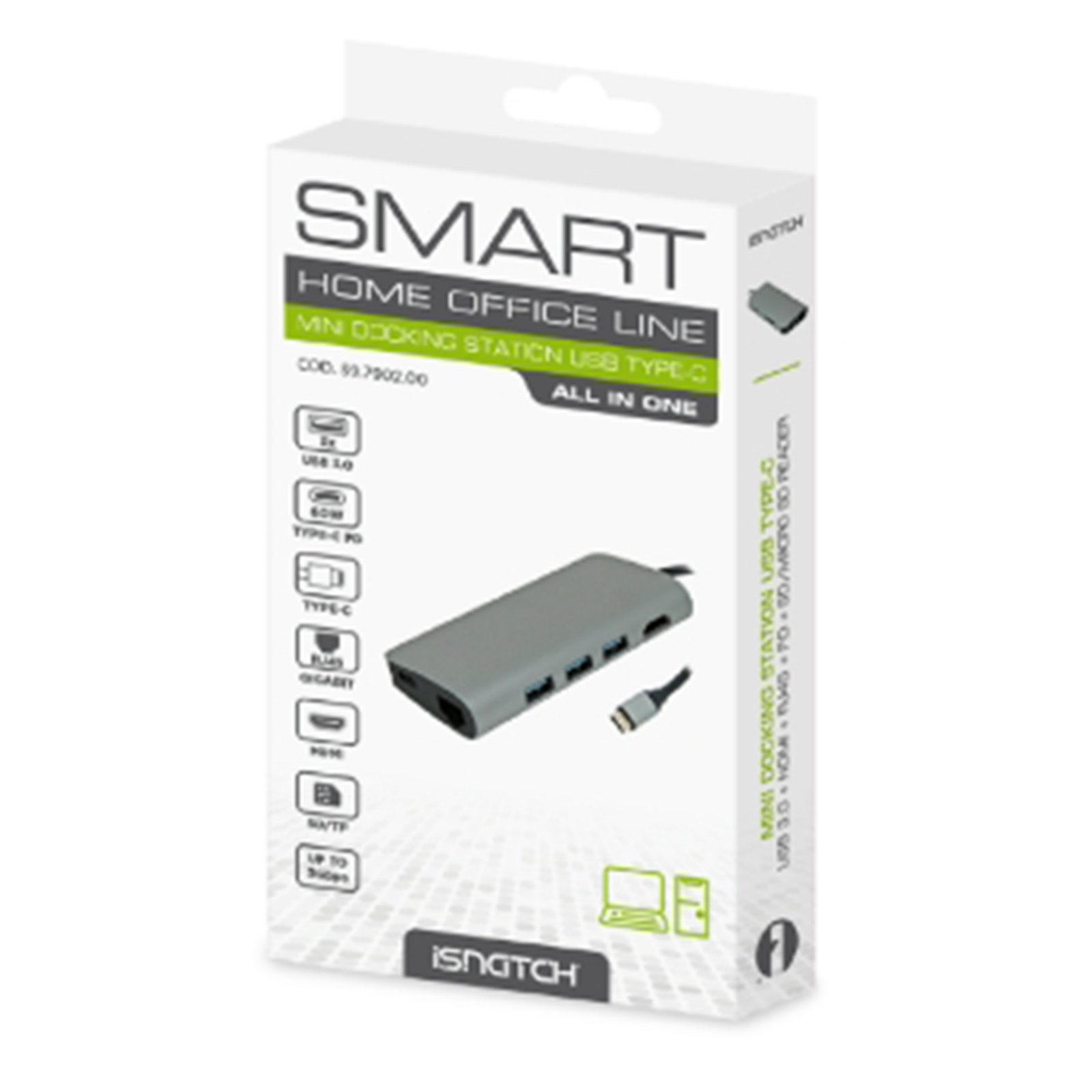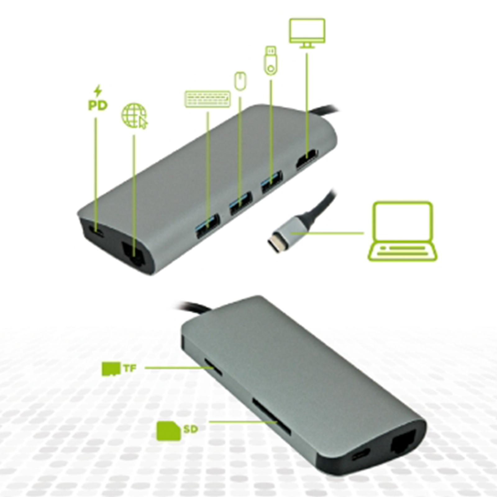 Aggiunge ad un notebook 3 porte USB-A 3.0, una HDMI, una LAN Gigabit, un lettore SD card, un lettore TF card, una USB Type-C PD. La porta HDMI supporta risoluzioni fino a 4K@30Hz UHD 3840x216 pixel. La porta Type-C PD fornisce fino a 60W per ricaricare e/o alimentare dispositivi dotati d'ingresso USB Type-C.