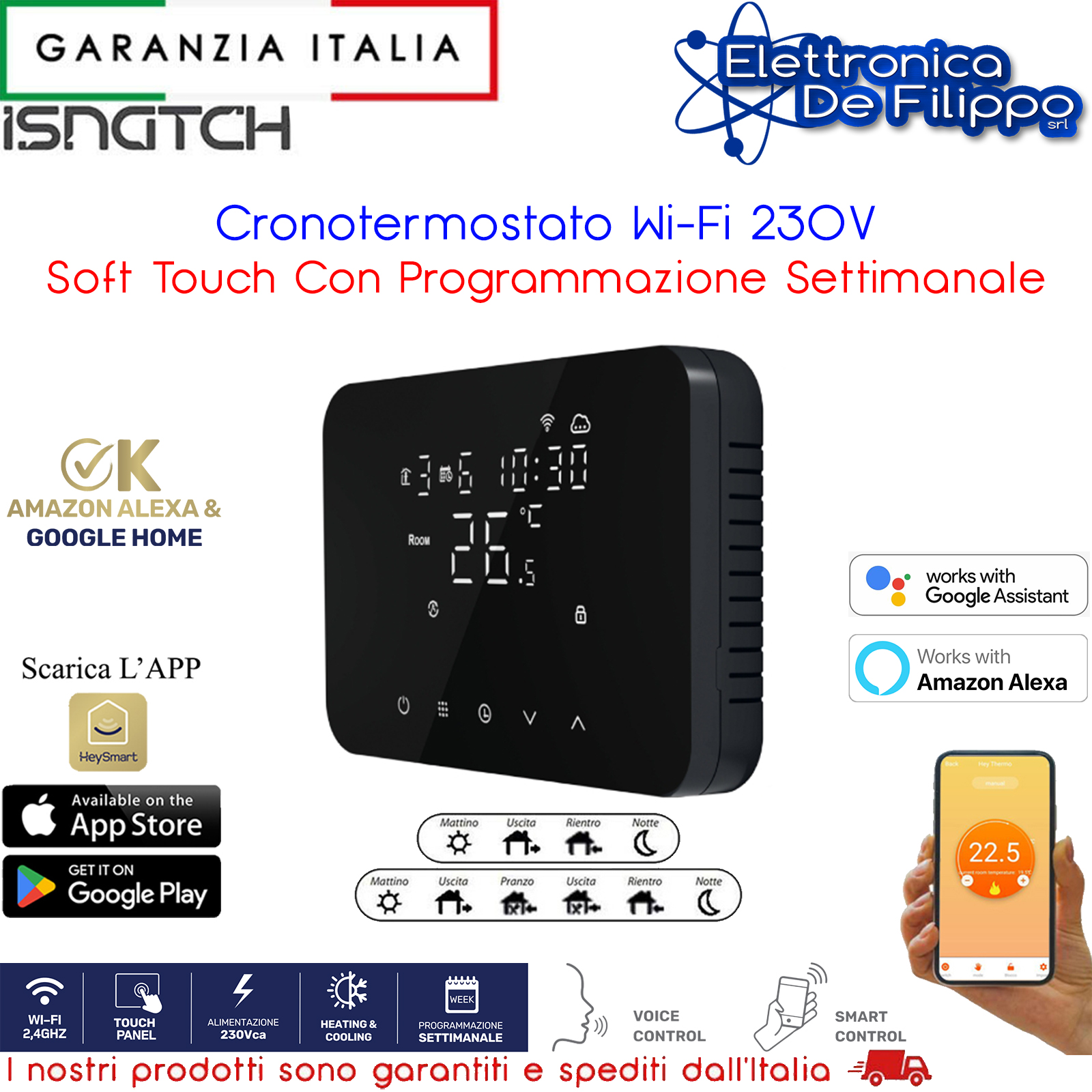 Cronotermostato Smart WI-FI con pannello soft-touch nero retro illuminato. Programmazione settimanale per il comando di impianti di riscaldamento o raffreddamento( funzione cooling). Richiede alimentazione diretta a 230V; permette di regolare e programmare la temperatura sia in locale tramite pannelo soft-touch che in remoto tramite App HeySmart per smartphone. Include la funzione antigelo e vacanza. Installabile direttamente su scatola 503. Controllabile anche con gli assistenti vocali Amazon Alexa e Google Home. Combinalo con i tuoi dispositivi HeySmart creando dei pratici scenari utili alla vita di tutti i giorni!
