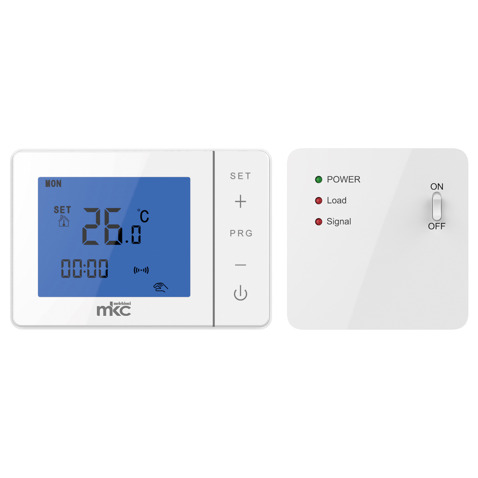 MK-725 è un cronotermostato digitale settimanale wireless semplice nell’uso e di grande versatilità. Adatto per il controllo della temperatura dei dispositivi con contatto di attivazione a due fili (caldaie murali, bruciatori a gasolio, ecc.), è composto da una unità di un controllo remoto con funzionamento a batteria, posizionabile ovunque all’interno dell’abitazione, ed una unità di potenza da collegare alla caldaia. La connettività wireless a 4,33Mhz tra unità di controllo e di potenza garantisce un una alta stabilità di trasmissione dei comandi. MK-725 unisce alla funzionalità pratica un elegante design di forma squadrata, di colore bianco con superfici lisce al tatto. Provvisto di ampio display nella parte superiore con retroilluminazione di colore blu e un selettore rotativo per la programmazione posta nella parte bassa frontale, è inoltre dotato inoltre di sensore termico al centro del bordo inferiore e staffa di fissaggio posteriore con contatti a pettine, installabile con cavi in canalina sia da incasso che da appoggio, morsetti a vite e doppio foro di fissaggio per tasselli con regolazione XY, sia per l’unità di controllo che per l’unità di potenza.