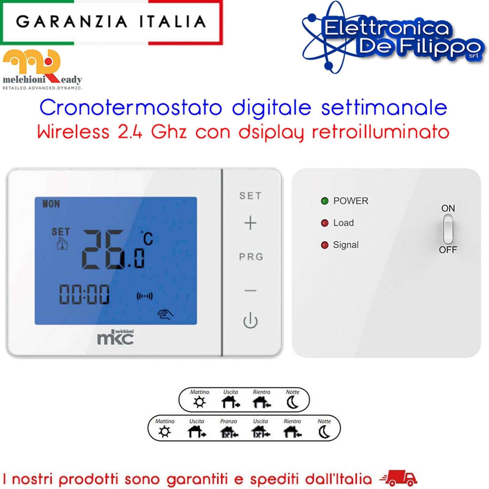 Cronotermostato MK-725. Esso rappresenta la soluzione ideale per la gestione di apparecchi di controllo termico di ogni ambiente residenziale, commerciale o ufficio. Grazie al collegamento wireless, l’ MK-725 risolve il problema della distanza tra il posizionamento della caldaia e l’area da riscaldare: sarà infatti possibile controllare caldaie e riscaldatori elettrici posti in cantine, solai, disimpegni, centrali termiche, garantendo la corretta gestione climatica delle zone di residenza. L’unità di controllo, grazie all’alimentazione a batterie ed il controllo via radio dell’unità di potenza, potrà essere posizionata in qualunque punto senza la necessità di alcun collegamento elettrico.