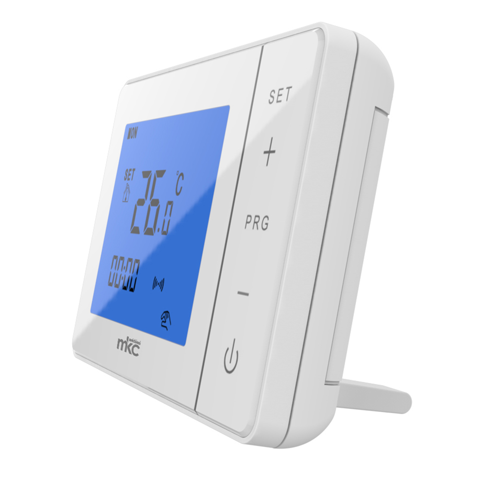 MK-725 è un cronotermostato digitale settimanale wireless semplice nell’uso e di grande versatilità. Adatto per il controllo della temperatura dei dispositivi con contatto di attivazione a due fili (caldaie murali, bruciatori a gasolio, ecc.), è composto da una unità di un controllo remoto con funzionamento a batteria, posizionabile ovunque all’interno dell’abitazione, ed una unità di potenza da collegare alla caldaia. La connettività wireless a 4,33Mhz tra unità di controllo e di potenza garantisce un una alta stabilità di trasmissione dei comandi. MK-725 unisce alla funzionalità pratica un elegante design di forma squadrata, di colore bianco con superfici lisce al tatto. Provvisto di ampio display nella parte superiore con retroilluminazione di colore blu e un selettore rotativo per la programmazione posta nella parte bassa frontale, è inoltre dotato inoltre di sensore termico al centro del bordo inferiore e staffa di fissaggio posteriore con contatti a pettine, installabile con cavi in canalina sia da incasso che da appoggio, morsetti a vite e doppio foro di fissaggio per tasselli con regolazione XY, sia per l’unità di controllo che per l’unità di potenza.
