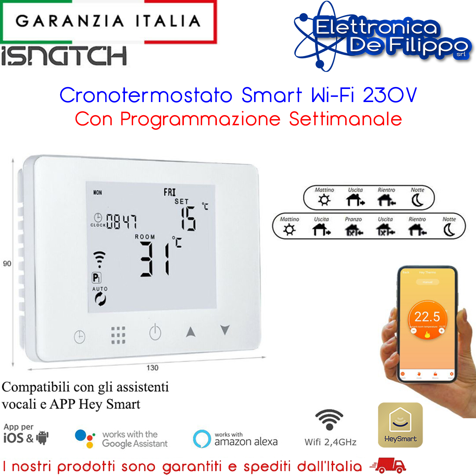 Cronotermostato SMART WI-FI con programmazione settimanale per il comando di impianti di riscaldamento con caldaie a 230V. Funziona tramite alimentazione diretta a 230V; permette di regolare e programmare la temperatura sia in locale che direttamente da smartphone; include funzione antigelo e vacanza. Possibilità di utilizzarlo sia con impianti di riscaldamento che di raffreddamento. Installabile direttamente su scatola 503. Controllabile tramite App HeySmart, assistenti vocali Google Home ed Alexa, tramite tasti soft-touch, schermo retro illuminato. Combinalo con i tuoi dispositivi HeySmart creando dei pratici scenari utili alla vita di tutti i giorni!
