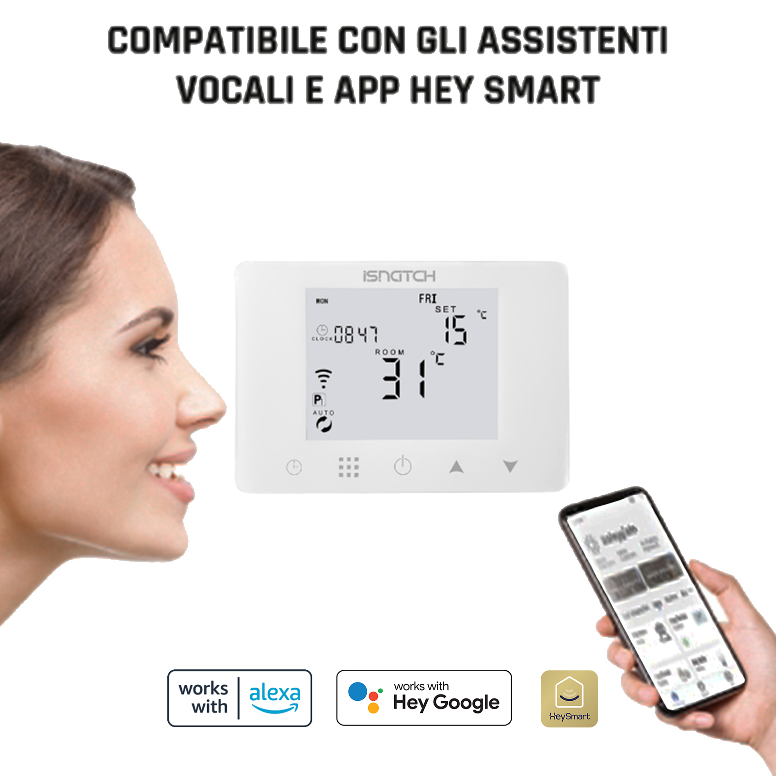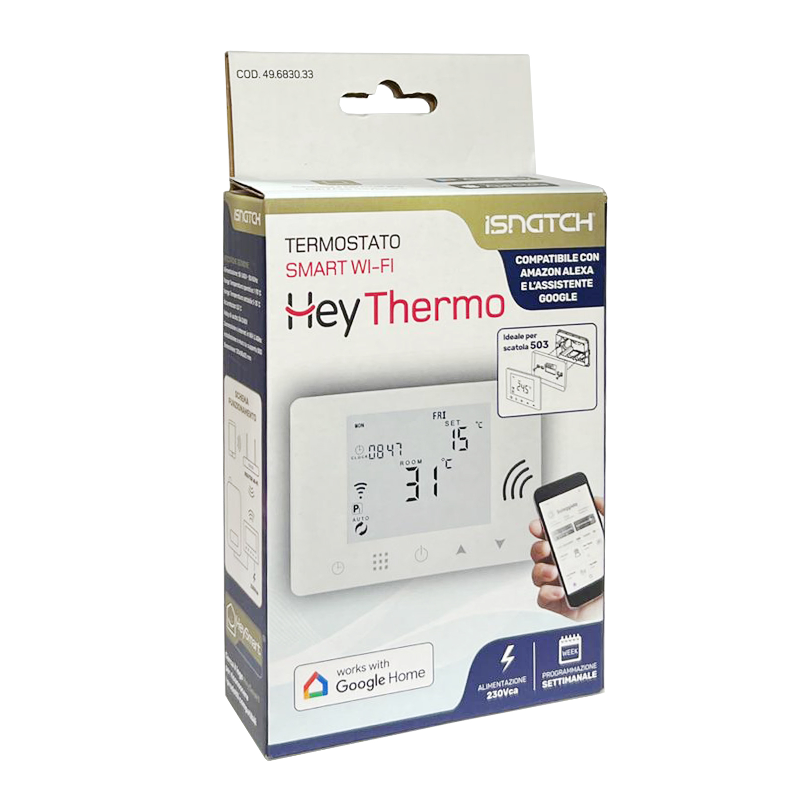 Cronotermostato SMART WI-FI con programmazione settimanale per il comando di impianti di riscaldamento con caldaie a 230V. Funziona tramite alimentazione diretta a 230V; permette di regolare e programmare la temperatura sia in locale che direttamente da smartphone; include funzione antigelo e vacanza. Possibilità di utilizzarlo sia con impianti di riscaldamento che di raffreddamento. Installabile direttamente su scatola 503. Controllabile tramite App HeySmart, assistenti vocali Google Home ed Alexa, tramite tasti soft-touch, schermo retro illuminato. Combinalo con i tuoi dispositivi HeySmart creando dei pratici scenari utili alla vita di tutti i giorni!