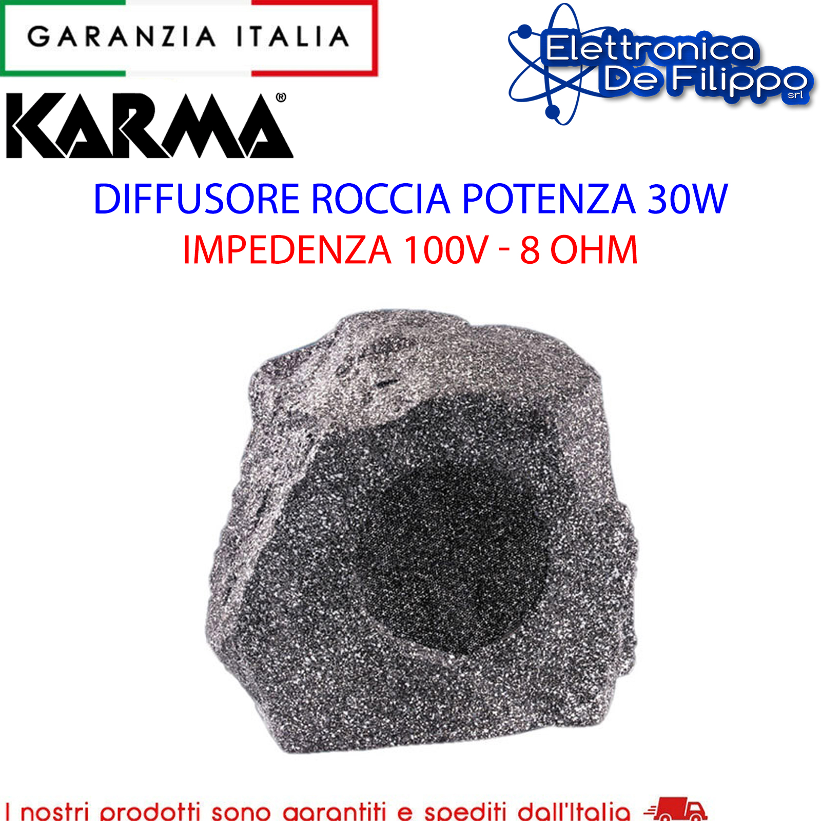 DESCRIZIONE Diffusore per esterno IP54 da giardino a forma di roccia in materiale impermeabile, con finitura Grigio/nero come la roccia granitica. Di ottima fattura, si integra perfettamente in ambienti all’aperto come: giardini, terrazzi, spiagge, piscine, ecc. Una potenza di 30W RMS un woofer a due vie garantisce un suono potente e corposo sia sulle frequenze medio basse che sulle alte frequenze. L’impedenza di lavoro a 100V/ 8Ohm permette l’utilizzo in impianti in filodiffusione o impianti Audio stereo.