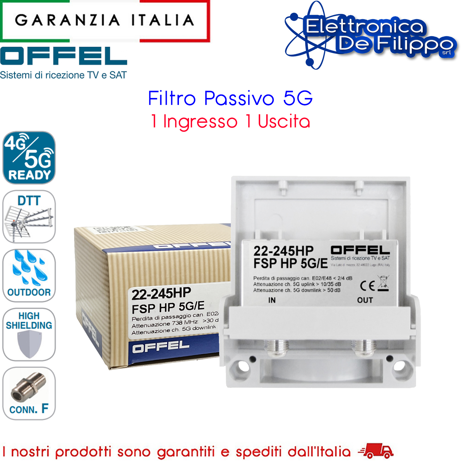 Filtro "in line" che consente il passaggio dei canali televisivi E02÷E48, attenuando le frequenze al di sopra dei 694 MHz (can. E49÷E69), destinate ai servizi di telefonia mobile a standard LTE, i cosiddetti 4G e 5G. Realizzato in contenitore schermato con connettori a vite tipo F. Dotato di passaggio di tensione per la telealimentazione