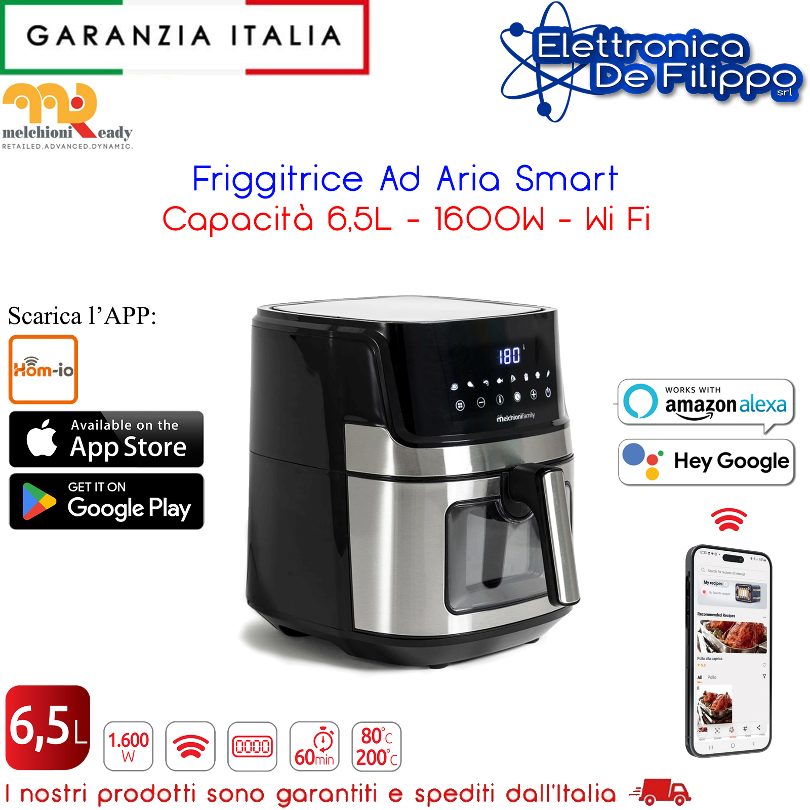 Grazie all’App Hom-io inclusa, la tua esperienza in cucina diventa ancora più straordinaria. L’applicazione è progettata per essere intuitiva e ricca di ricette che ti ispireranno ogni giorno. Non sarai mai solo ai fornelli con Hom-io, poiché avrai sempre un supporto in cucina. Ma la sorpresa più grande? La compatibilità con Amazon Alexa e Google Home! Con un semplice comando vocale, potrai regolare la temperatura e il timer, senza dover alzare un dito.