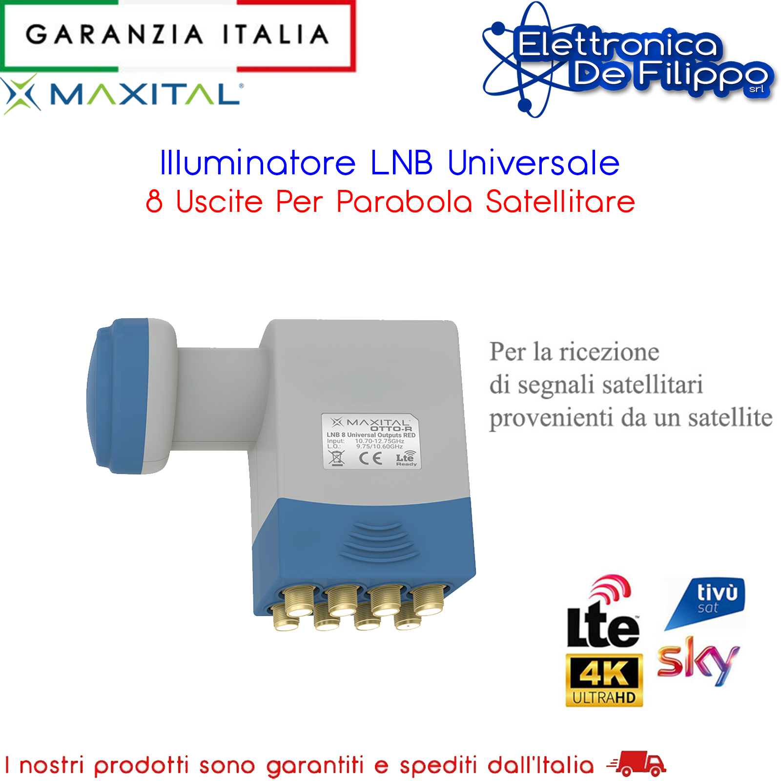 Convertitore Low Noise Converter RED Certified con bassa figura di rumore di 0,3 dB e 8 uscite universali. Consente la ricezione di segnali satellitari provenienti da una posizione orbitale.