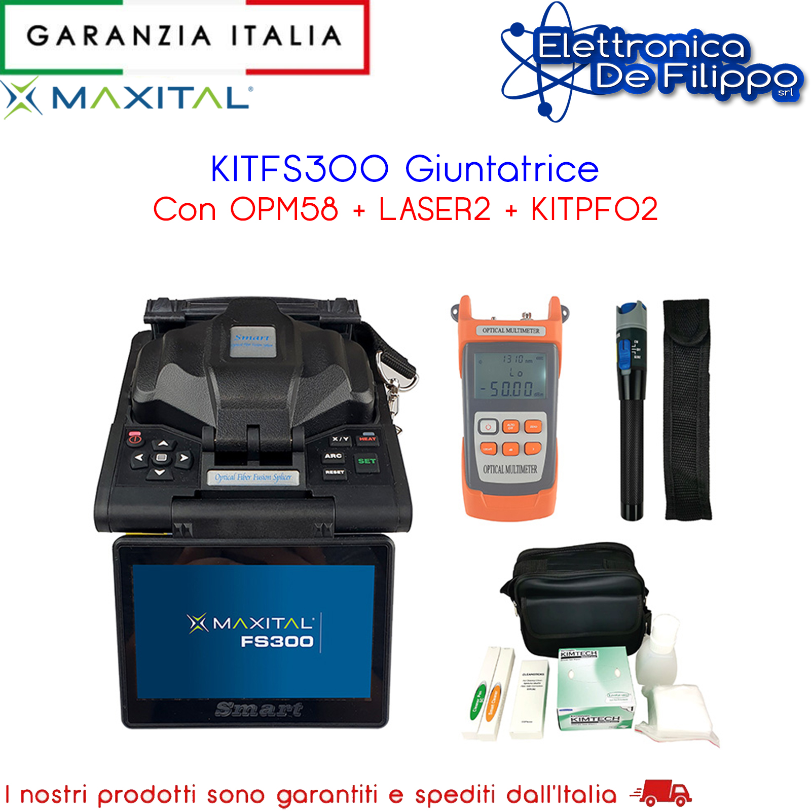 Kit giuntatrice comprensivo di giuntatrice FS300, 1 misuratore di potenza ottica OPM58, 1 laser a impulsi per test fibra ottica LASER2, 1 kit di pulizia per fibra ottica KITPF02.