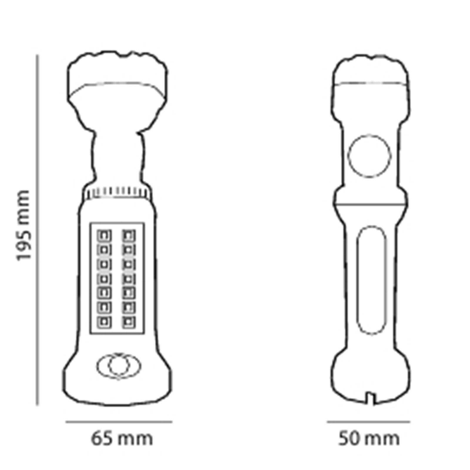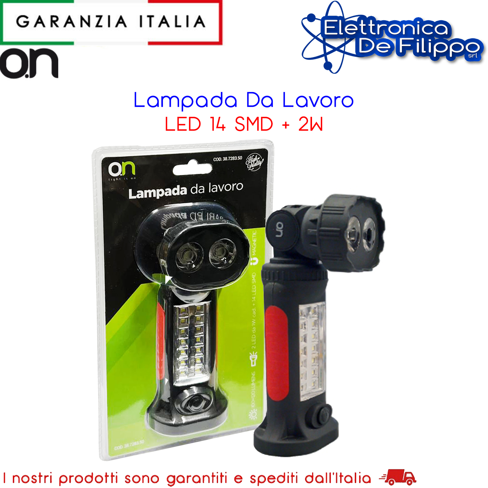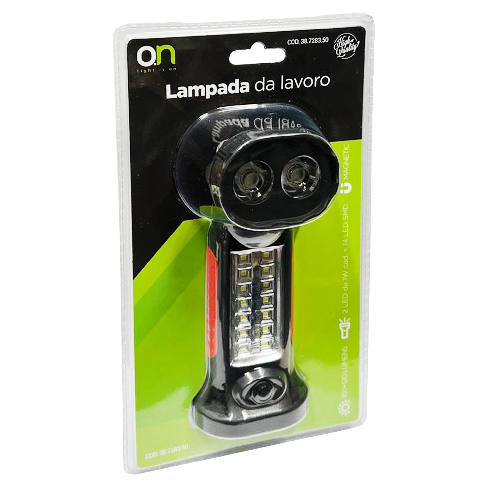 Lampada da lavoro con 2 LED da 1W cad. in testa + 14 LED SMD, testa orientabile a 180°, 100+120 Lumens, piedistallo basculante con calamita, gancio per sospensione, finitura gommata antisdrucciolevole, dimensioni 65x50x195mm., alimentazione 4 batterie AAA (non incluse).
