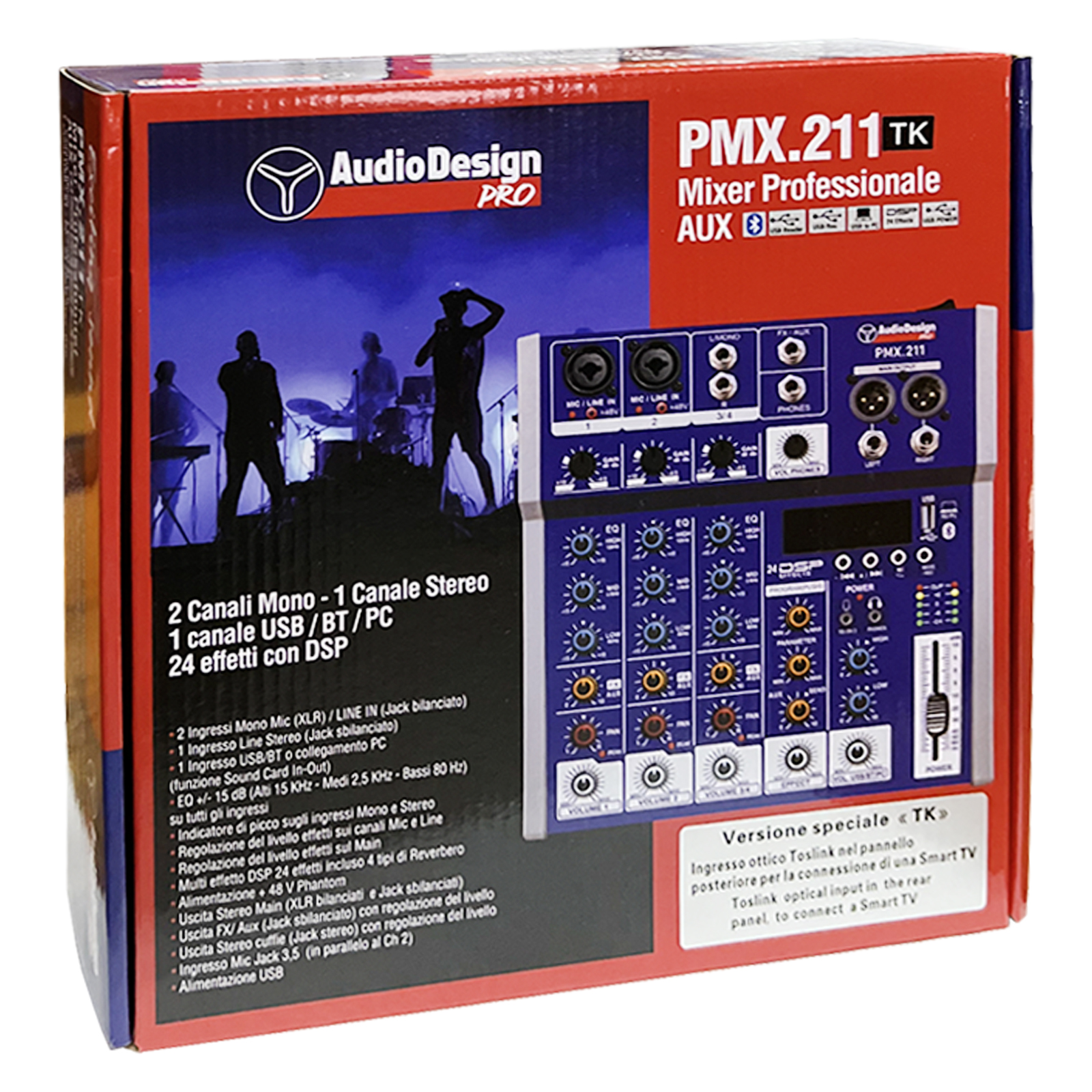 I modelli PMX.211 TK e PMX.411 TK hanno una caratteristica esclusiva e cioè la possibilità di un ingresso "ottico" (Toslink). Questa connessione, attivabile con apposito pulsante, dà la possibilità di una connessione con una Smart TV e quindi è l'ideale ad esempio per una Karaoke oppure per l’amplificazione del audio del televisore in ambienti pubblici.