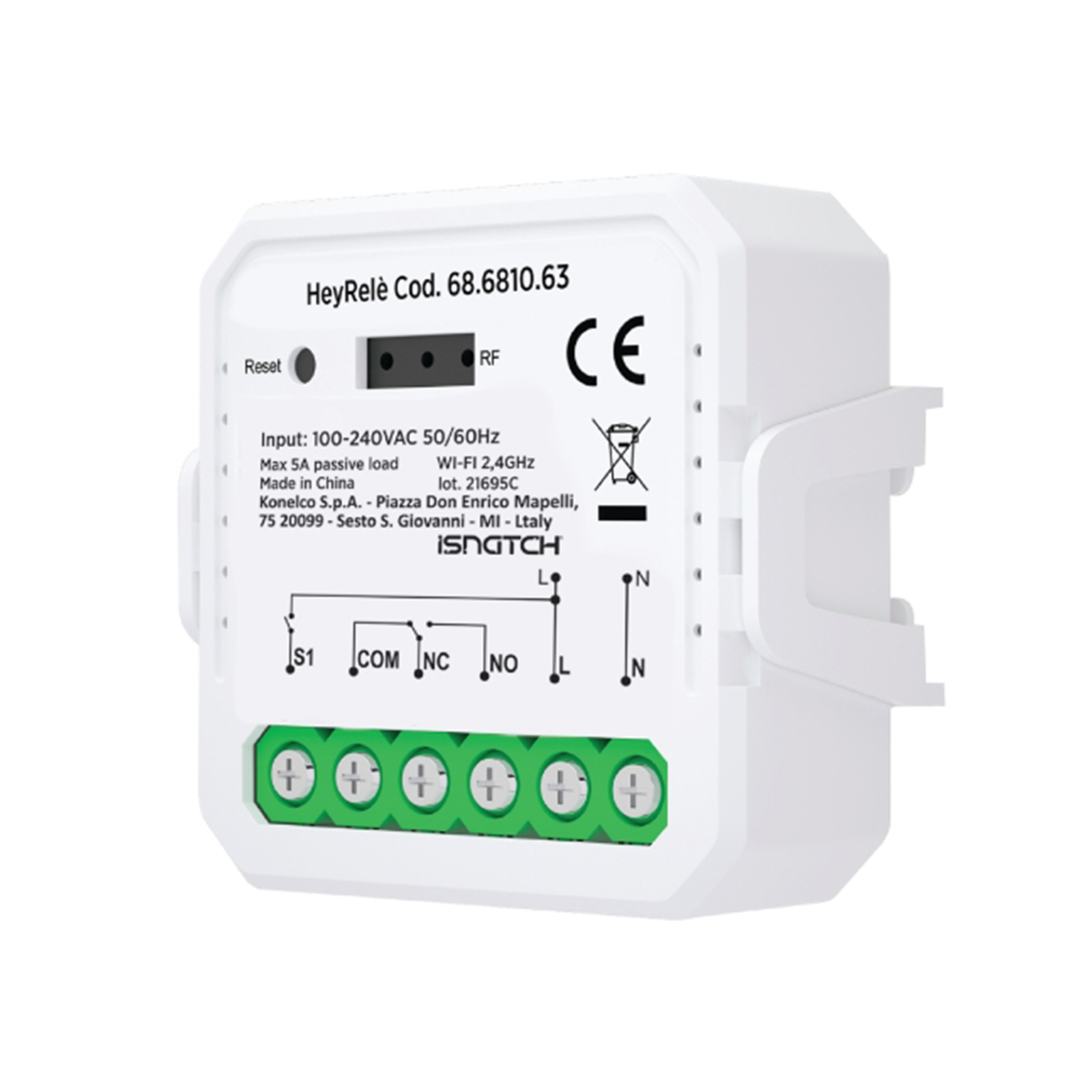 HeyRelé è un modulo domotico avanzato, che incorpora un relé a contatto pulito. Gestisce con precisione e sicurezza una vasta gamma di sistemi elettrici come illuminazione, attuatori, pompe, centraline di motori ed elettro-serrature. Con la sua versatilità, puoi gestire e automatizzare qualsiasi dispositivo o sistema per renderlo smart. Alimentato a 230V e dotato di un ingresso per il controllo manuale tramite pulsante, installabile su binario DIN (supporto incluso) o incasso, HeyRelé diventa un'aggiunta essenziale alla tua casa intelligente. Collegalo alla rete Wi-Fi e tramite l'app HeySmart, controlla e gestisci l'azione del contatto relé da remoto. Puoi impostare per esempio la durata dell'apertura di un cancello con elettro-serratura per l'arrivo dell'addetto alle pulizie o al ritorno dei figli a casa, quindi programmando il timer per aprire o chiudere il contatto in base alle tue esigenze. Compatibile con assistenti vocali come Amazon Alexa e Google Home.