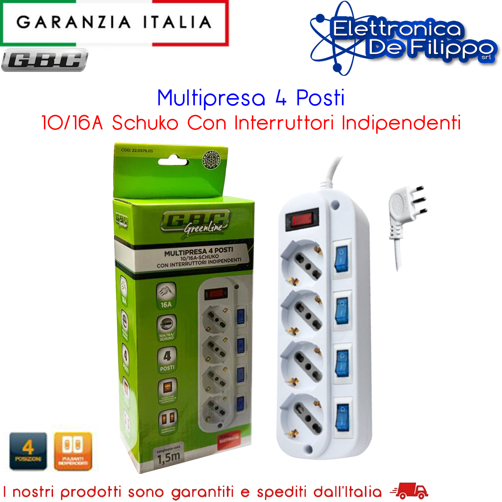 Multipresa 4 posti tripasso 10/16A/SCHUKO e spina 16A. Con alveoli schermati e grado di protezione 2,1. Interruttore generale e singolo per ogni presa luminoso. Carico max 3500W. Cavo 1,5m