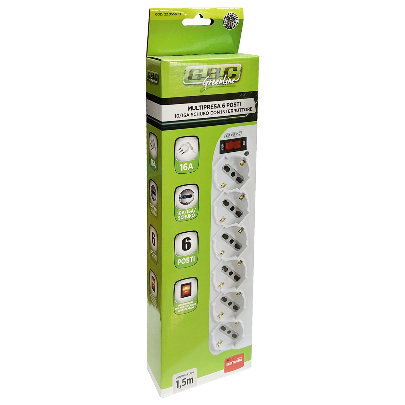 Multipresa 6 posti tripasso 10/16A/SCHUKO e spina 16A. Con alveoli schermati e grado di protezione 2,1. Interruttore generale luminoso con protezione da sovraccarico. Carico max 3500W. Cavo 1,5m