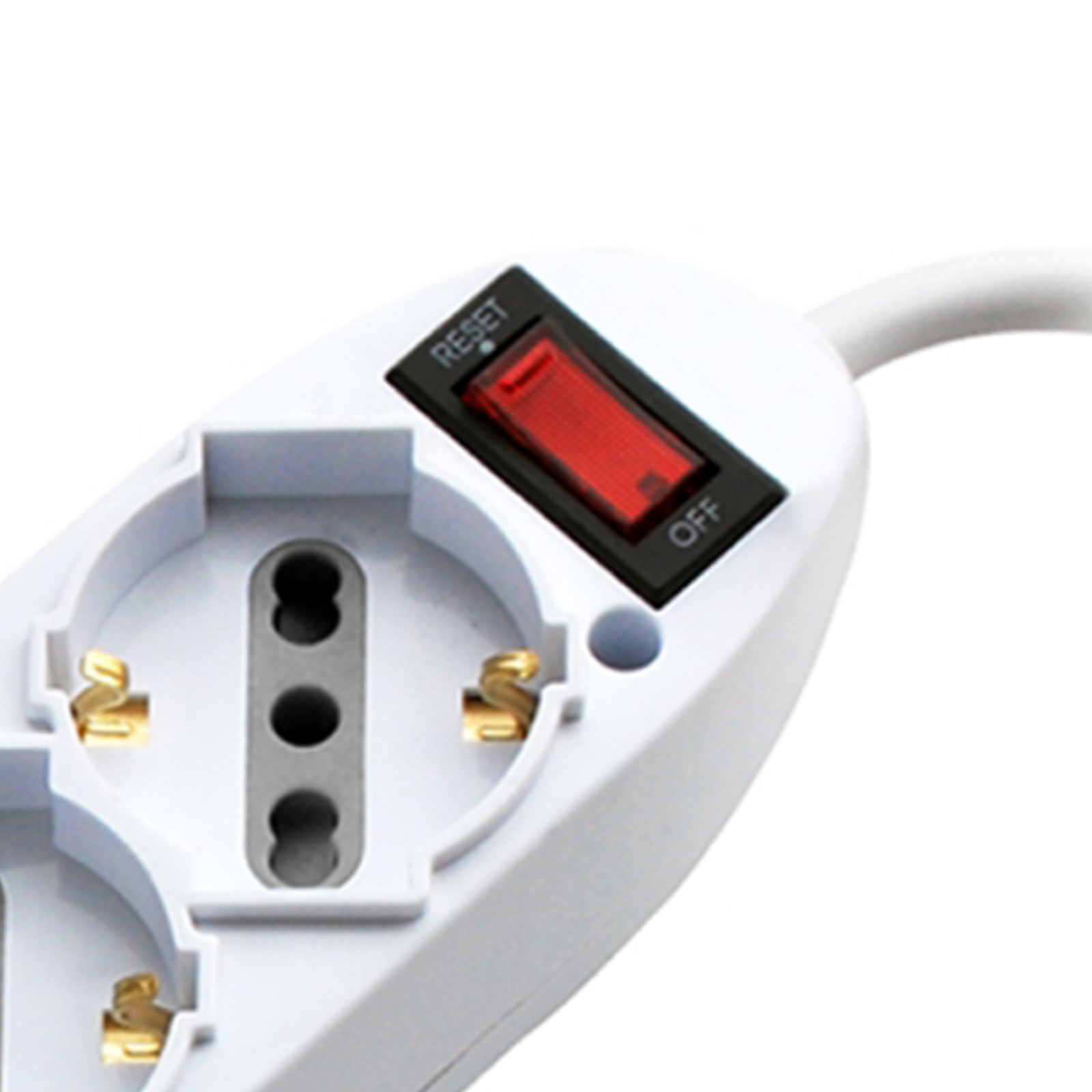Multipresa 6 posti tripasso 10/16A/SCHUKO e spina 16A. Con alveoli schermati e grado di protezione 2,1. Interruttore generale luminoso con protezione da sovraccarico. Carico max 3500W. Cavo 1,5m