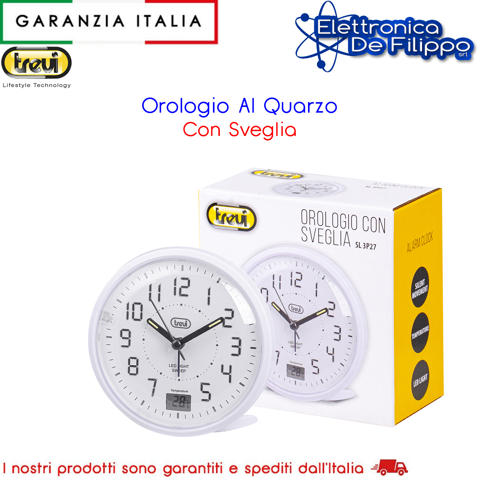 Con l’Orologio al Quarzo con Sveglia Trevi SL 3P27 potrai tenere sempre sotto controllo l’ora ed evitare inutili ritardi. Dotato di movimento silenzioso Sweep a secondi continui, ti garantirà un riposo tranquillo senza il fastidioso ticchettio delle lancette. Sull’orologio di Trevi puoi impostare una sveglia, che si attiverà con una suoneria elettronica, all’orario da te preferito e, premendo il tasto Snooze sulla parte superiore dell’apparecchio, potrai momentaneamente interrompere l’allarme. La super retroilluminazione a led ti consentirà una facile consultazione di SL 3P27 anche durante le ore notturne. Utile è il piccolo riquadro nella parte inferiore del quadrante, in cui puoi trovare la temperatura, per averla sempre sott’occhio e non farti trovare impreparato in caso di cambi repentini. L’alimentazione è predisposta con una batteria di tipo AA (non inclusa).