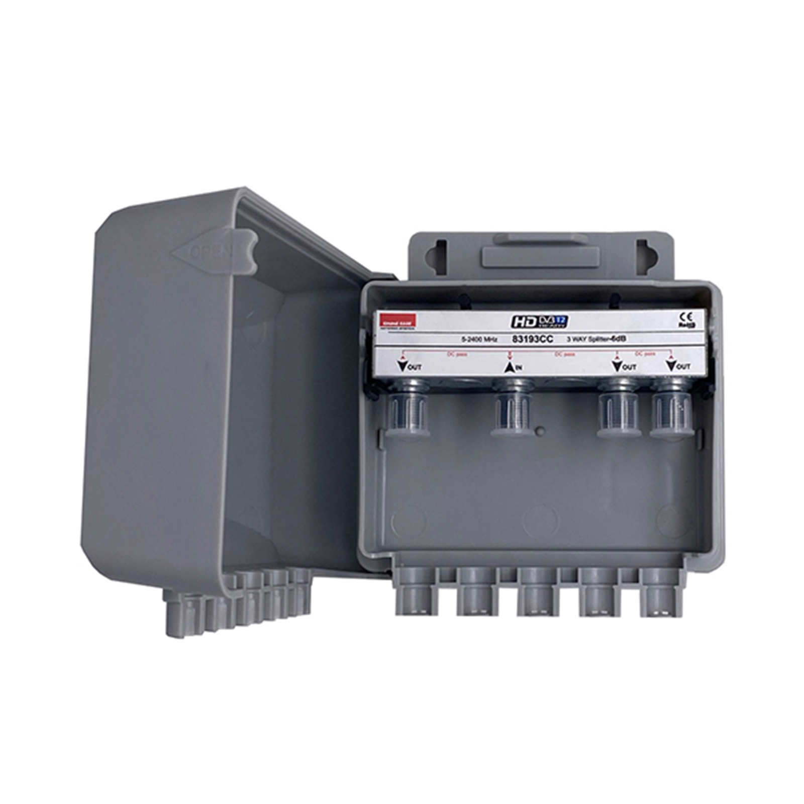 Partitori da palo TV/SAT con elevato adattamento di impedenza, passaggio di corrente su tutte le uscite e diodi di protezione. Sono interamente schermati, provvisti di connettori tipo "F" e realizzati con componenti di alta qualità a garanzia di basse perdite di inserzione e alta selettività. La custodia in plastica antiurto, fornisce la massima protezione dagli agenti atmosferici. Uno degli aspetti più esclusivi di questi partitori è la possibilità di alimentare il centralino TV da tutte le uscite verso le utenze. Questa funzione è molto utile in strutture come gli appartamenti per le vacanze, dove spesso alcuni alloggi ciascun appartamento con il proprio alimentatore per garantire in ogni caso il funzionamento del centralino TV. Possono anche essere utilizzati in un impianto Satellite con LNB dCSS, per ripartire a monte il segnale da distribuire su più utenze.