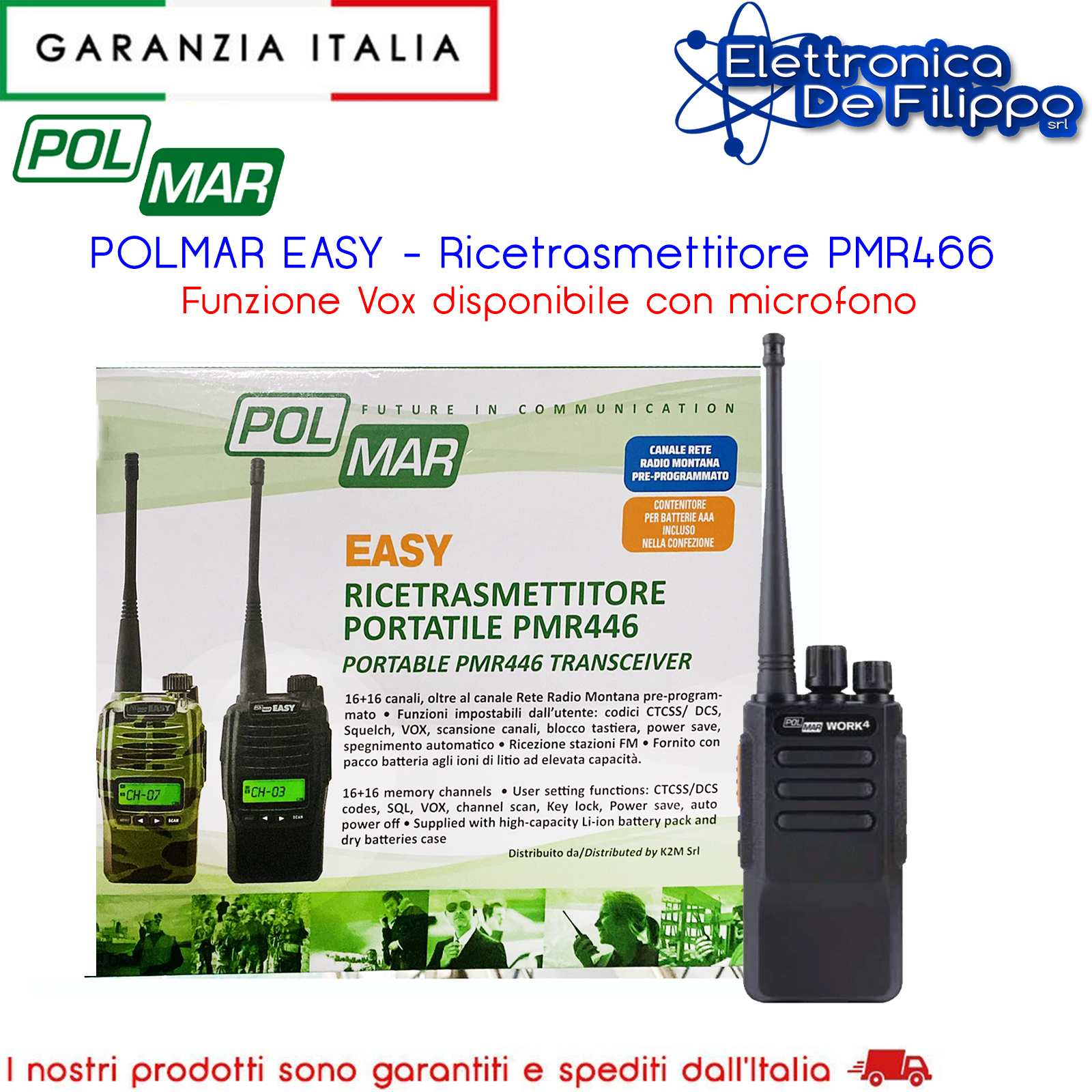 Gamma operativa: 446.00625 MHz ~ 446.09375 MHz Canali di memoria: 8 + 8 Potenza RF: 0,5W Tensione operativa: 7,4V Alimentazione: batteria Li-Ion – 7,4V/2200 mAh Temperatura operativa: -20°C - +60°C Sensibilità: -122dBm Dimensioni: 100 x 58 x 36 mm (antenna esclusa) Peso: 251 gr batteria inclusa