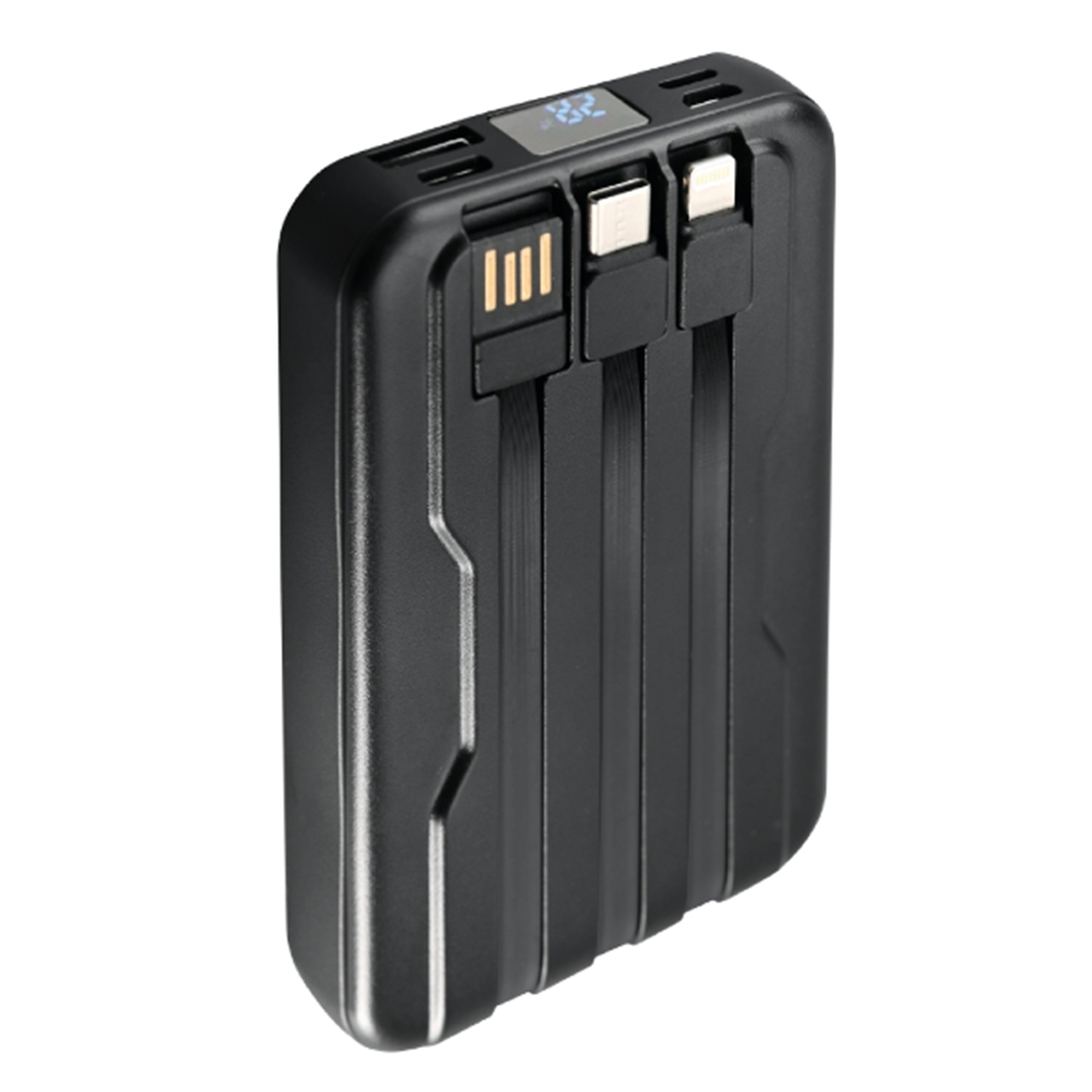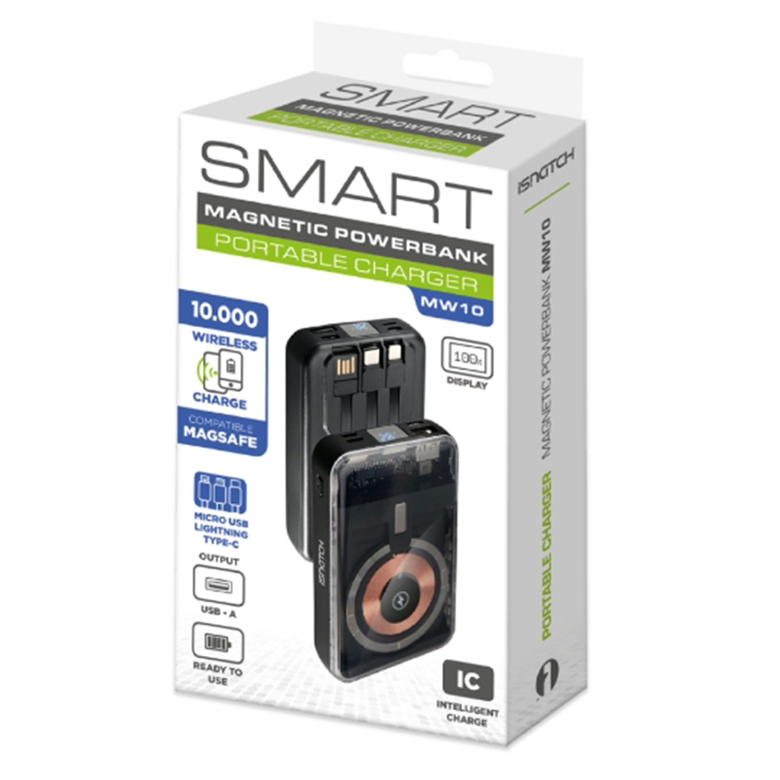 I Powerbank della serie MW 10000mAh ha design a circuito visibile. Con una potenza Max 5W per la ricarica wireless, prestare attenzione alla potenza del dispositivo. '3 porte USB piu' la funzione wireless ti consentono di gestire contemporaneamente 4 differenti dispositivi. Il sistema di controllo della carica, gestito da un display, è estremamente intuitivo, e gestisce sia la ricarica della Power Bank stessa, sia il controllo della ricarica dei dispositivi connessi. Integrano un cavetto Type-C , un cavetto Lightningh e un cavetto USB-A.