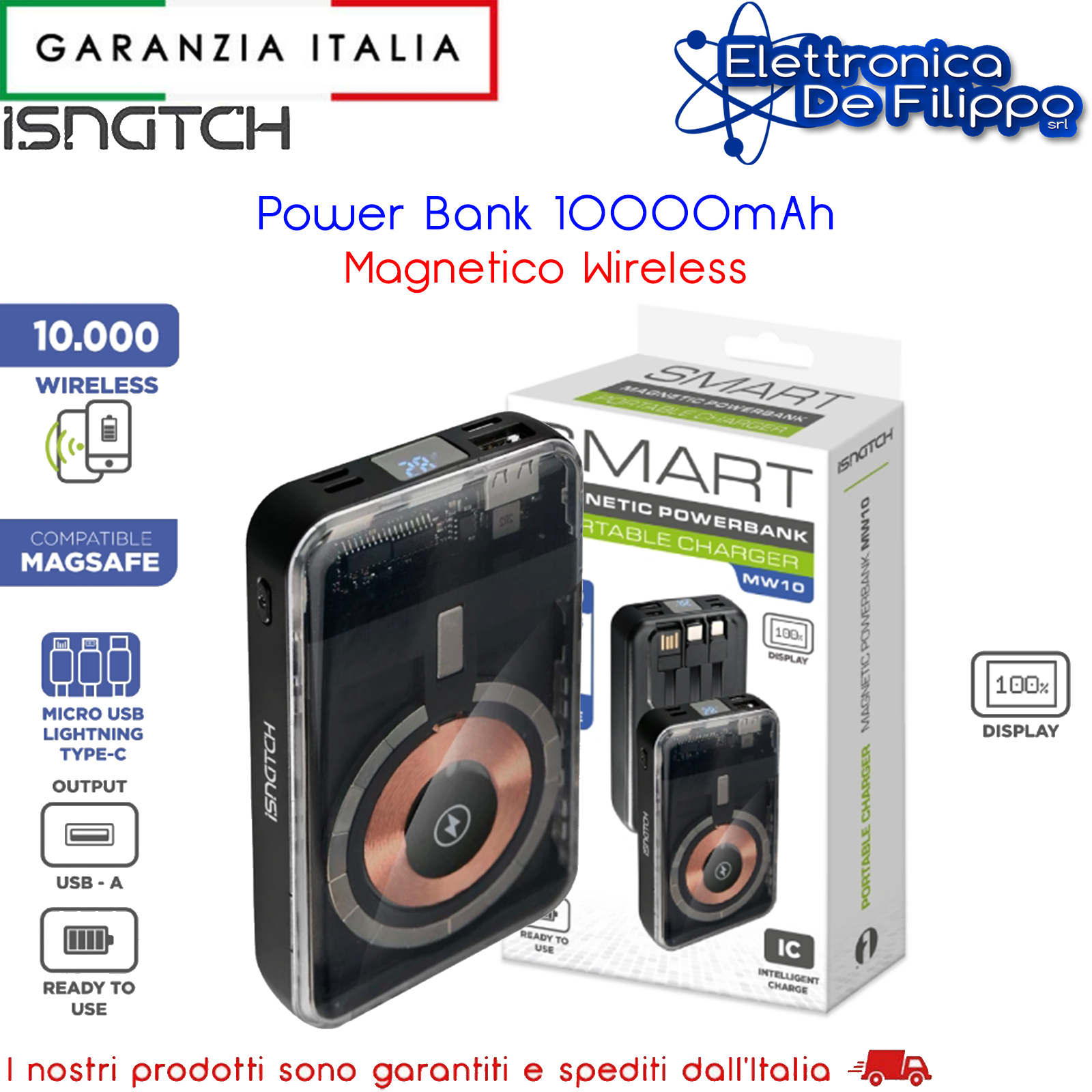 I Powerbank della serie MW 10000mAh ha design a circuito visibile. Con una potenza Max 5W per la ricarica wireless, prestare attenzione alla potenza del dispositivo. '3 porte USB piu' la funzione wireless ti consentono di gestire contemporaneamente 4 differenti dispositivi. Il sistema di controllo della carica, gestito da un display, è estremamente intuitivo, e gestisce sia la ricarica della Power Bank stessa, sia il controllo della ricarica dei dispositivi connessi. Integrano un cavetto Type-C , un cavetto Lightningh e un cavetto USB-A.