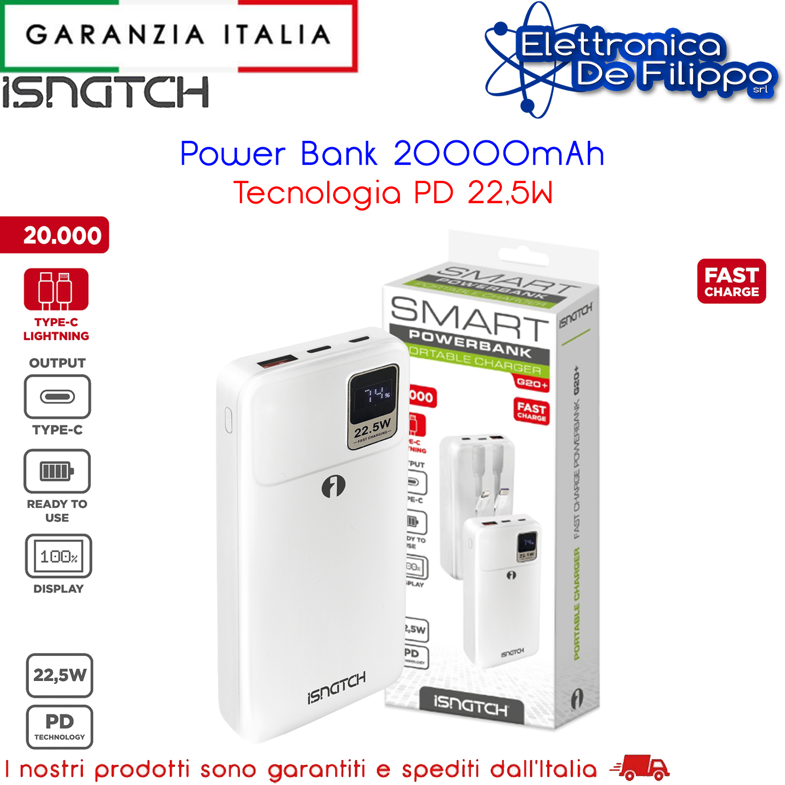 Le Power Bank della serie "G+" gestiscono il sistema di ricarica in uscita USB con tecnologia PD. Il sistema di controllo della carica, gestito da un display, è estremamente intuitivo, e gestisce sia la ricarica della Power Bank stessa, sia il controllo della ricarica dei dispositivi connessi.Identifica il dispositivo connesso e ottimizza la sua velocità di caricamento La grande capacità da 20000mAh la rendono perfetta per la ricarica supplementare degli Smartphone di ultima generazione. Integrano un cavetto Type-C e un cavetto Lightningh