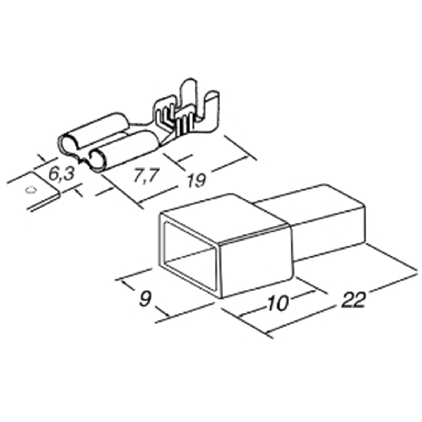20 Faston femmina - Ottone grezzo - Sezione cavo 1,0÷2,5 mmq - Dimensioni 6,3x0,8mm 10 Coprifaston rosso - Polietilene naturale 10 Coprifaston nero - Polietilene naturale