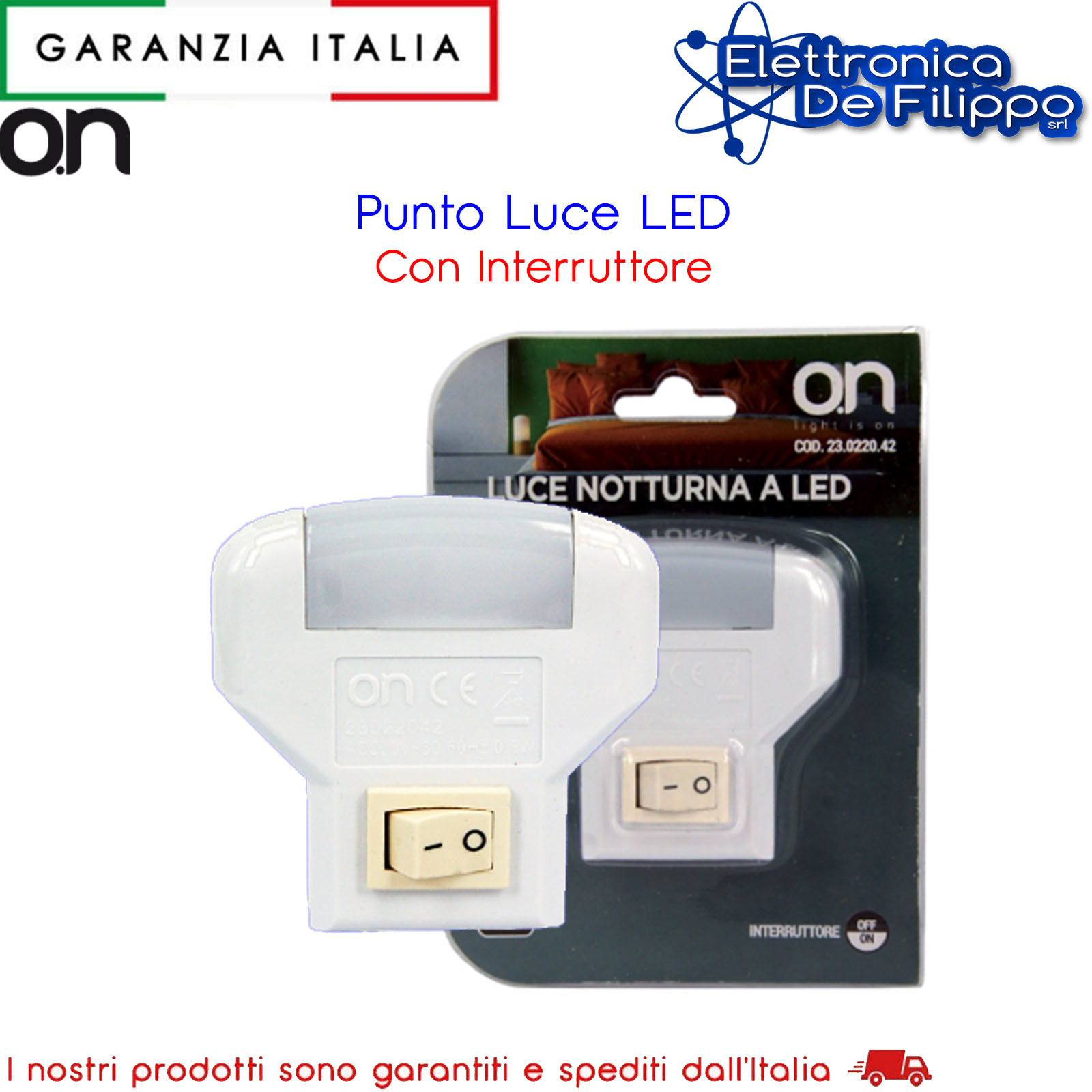 Luce notturna ideale per la camera dei bambini o comunque in tutti i locali o zone in cui sia necessaria una piccola luce come riferimento. Con spina 10A, si inserisce direttamente in qualsiasi presa rete a 230Vca.