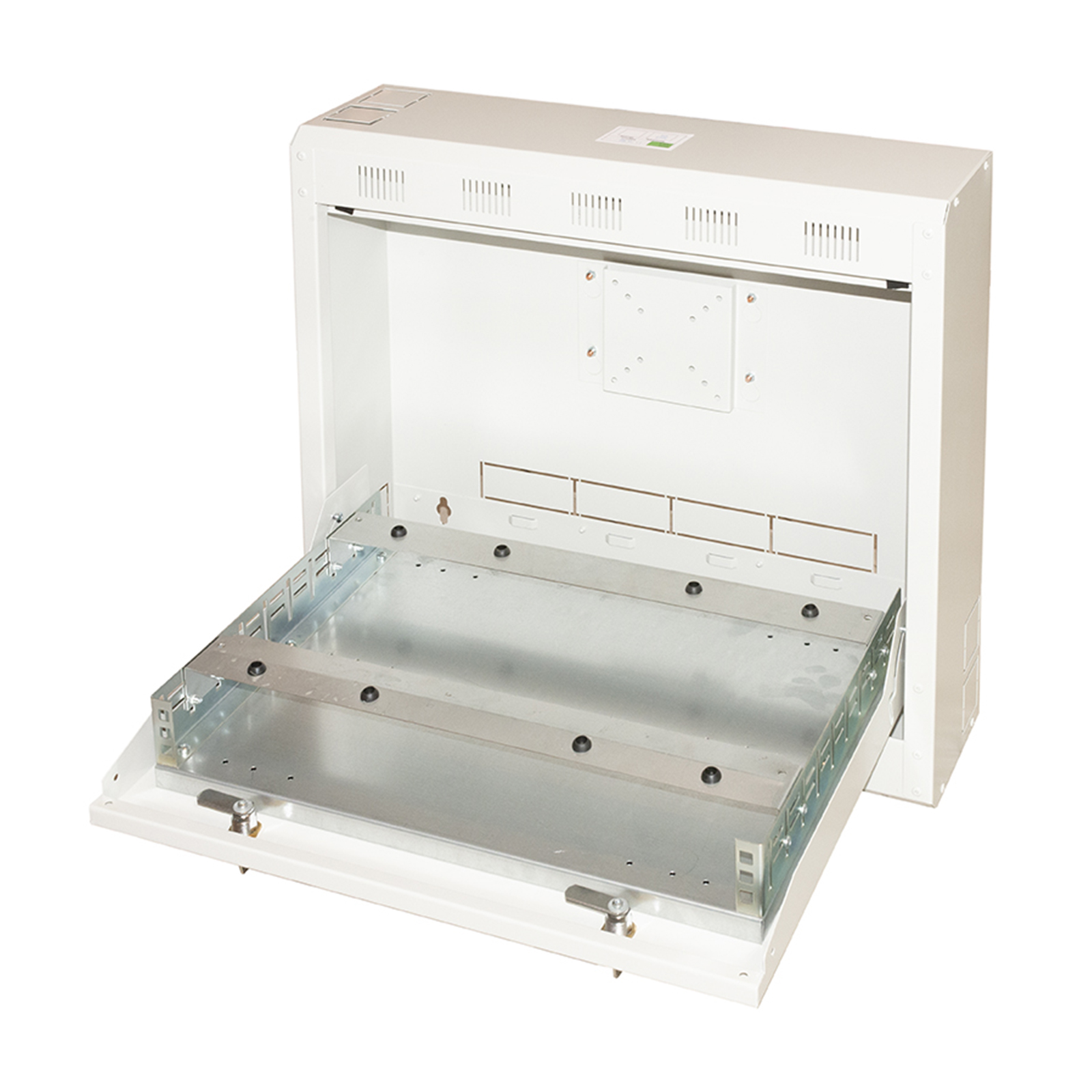 Box a muro per alloggiare in modo ottimale sistemi di videosorveglianza, sistemi audio, reti, NVR e DVR, con attacco interno per installare un video VESA 75X75 o 100X100, proteggendoli da accessi non autorizzati.
