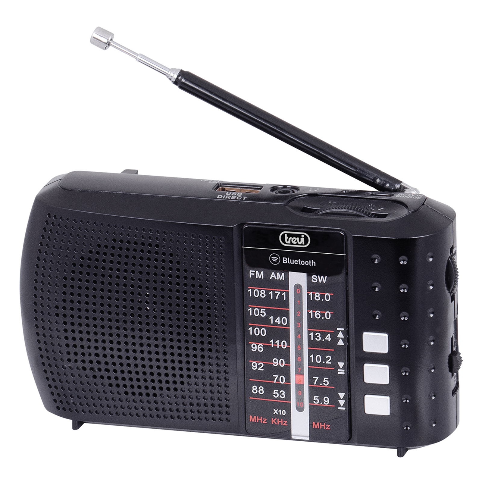Trevi RA 7F20 BT è una radio portatile multibanda, ideale per ascoltare le tue stazioni radio preferite ovunque vorrai. Dotata di ricevitore di onde FM, AM e SW, è in grado di garantirti alta qualità, massima sensibilità e precisione di sintonia. Con la radio portatile di Trevi potrai riprodurre anche le tue playlist musicali da memorie flash come chiavette USB e schede Micro-SD, oppure direttamente dai tuoi dispositivi compatibili grazie alla connessione Bluetooth. Trevi RA 7F20 BT è alimentata da una batteria al Lithio, comodamente ricaricabile tramite micro-USB.