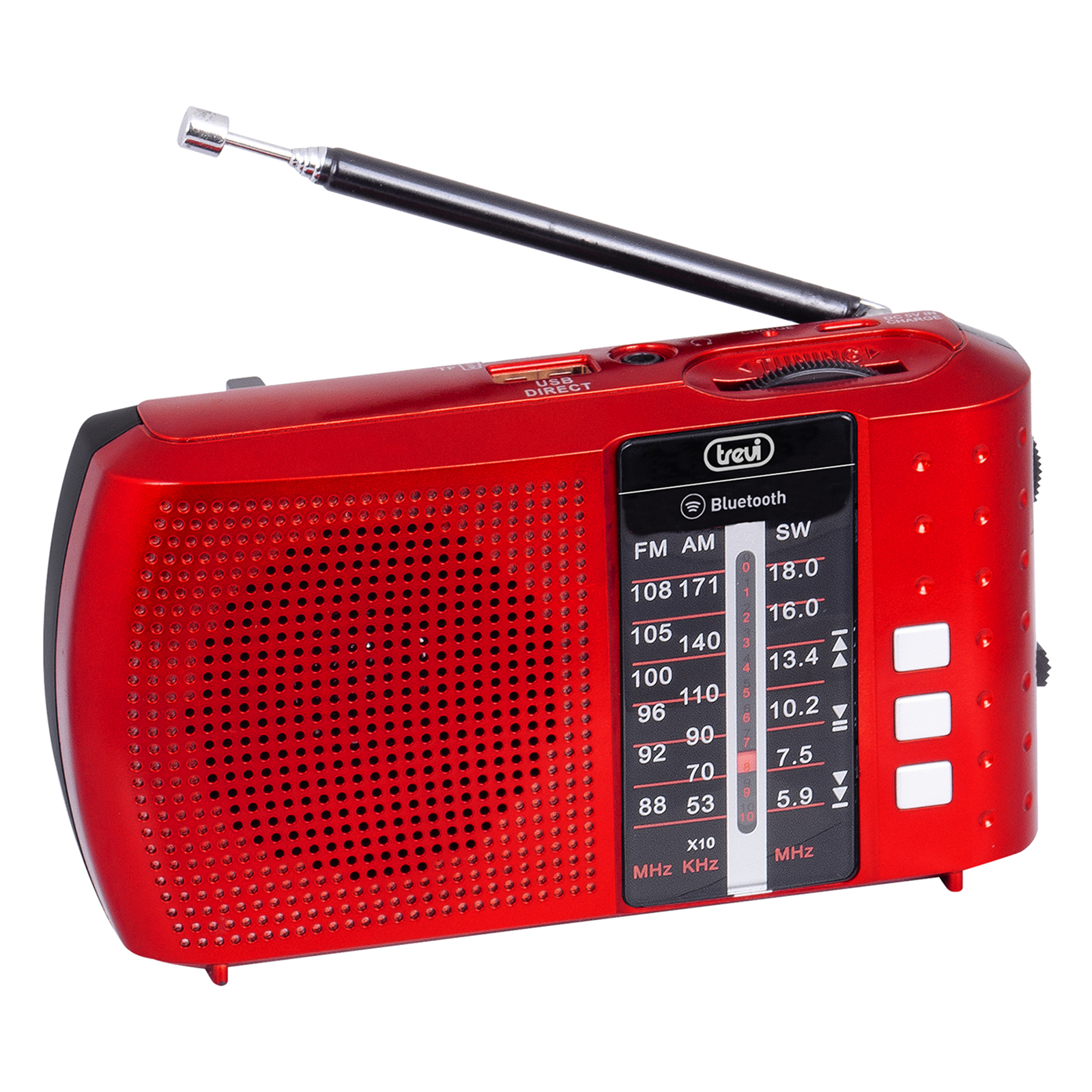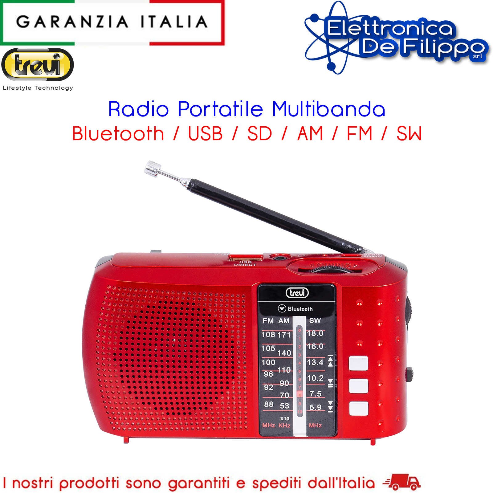 Trevi RA 7F20 BT è una radio portatile multibanda, ideale per ascoltare le tue stazioni radio preferite ovunque vorrai. Dotata di ricevitore di onde FM, AM e SW, è in grado di garantirti alta qualità, massima sensibilità e precisione di sintonia. Con la radio portatile di Trevi potrai riprodurre anche le tue playlist musicali da memorie flash come chiavette USB e schede Micro-SD, oppure direttamente dai tuoi dispositivi compatibili grazie alla connessione Bluetooth. Trevi RA 7F20 BT è alimentata da una batteria al Lithio, comodamente ricaricabile tramite micro-USB.