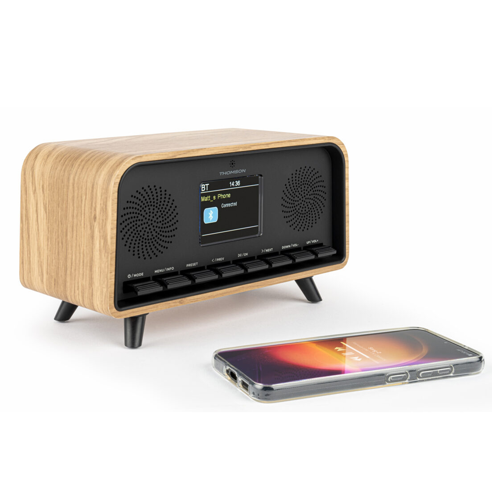 La Radiosveglia RT850DABBT Thomson unisce il fascino vintage del legno con funzionalità moderne: è infatti una radio DAB+ / FM con altoparlante Bluetooth integrato, perfetta per ascoltare musica in modalità wireless o tramite radio digitale. Lo schermo LCD ha un dimmer regolabile su tre livelli, così da adattare la luminosità alle tue preferenze e risparmiare energia. La funzione autoscan ti permette di memorizzare fino a 50 stazioni radio con facilità. Potrai svegliarti con due diversi allarmi, scegliendo tra sorgenti diverse, mentre l’ingresso AUX-IN 3,5 mm ti dà la libertà di collegare altri dispositivi audio. Un’antenna telescopica assicura una buona ricezione, mentre il lettore USB compatibile con MP3 ti consente di riprodurre musica direttamente da chiavetta. Con una potenza musicale totale di 30?W, questo dispositivo offre un audio pieno e chiaro, perfetto per la camera, lo studio o il salotto.