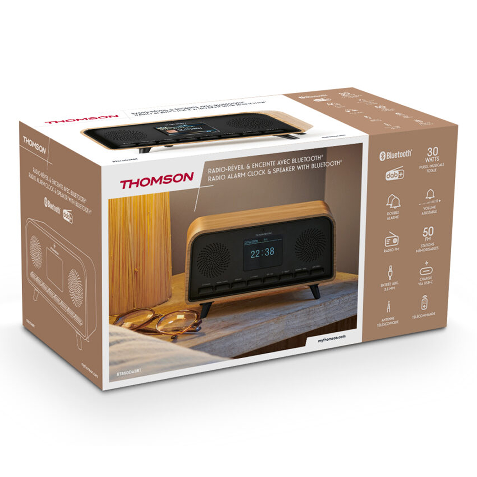 La Radiosveglia RT850DABBT Thomson unisce il fascino vintage del legno con funzionalità moderne: è infatti una radio DAB+ / FM con altoparlante Bluetooth integrato, perfetta per ascoltare musica in modalità wireless o tramite radio digitale. Lo schermo LCD ha un dimmer regolabile su tre livelli, così da adattare la luminosità alle tue preferenze e risparmiare energia. La funzione autoscan ti permette di memorizzare fino a 50 stazioni radio con facilità. Potrai svegliarti con due diversi allarmi, scegliendo tra sorgenti diverse, mentre l’ingresso AUX-IN 3,5 mm ti dà la libertà di collegare altri dispositivi audio. Un’antenna telescopica assicura una buona ricezione, mentre il lettore USB compatibile con MP3 ti consente di riprodurre musica direttamente da chiavetta. Con una potenza musicale totale di 30?W, questo dispositivo offre un audio pieno e chiaro, perfetto per la camera, lo studio o il salotto.