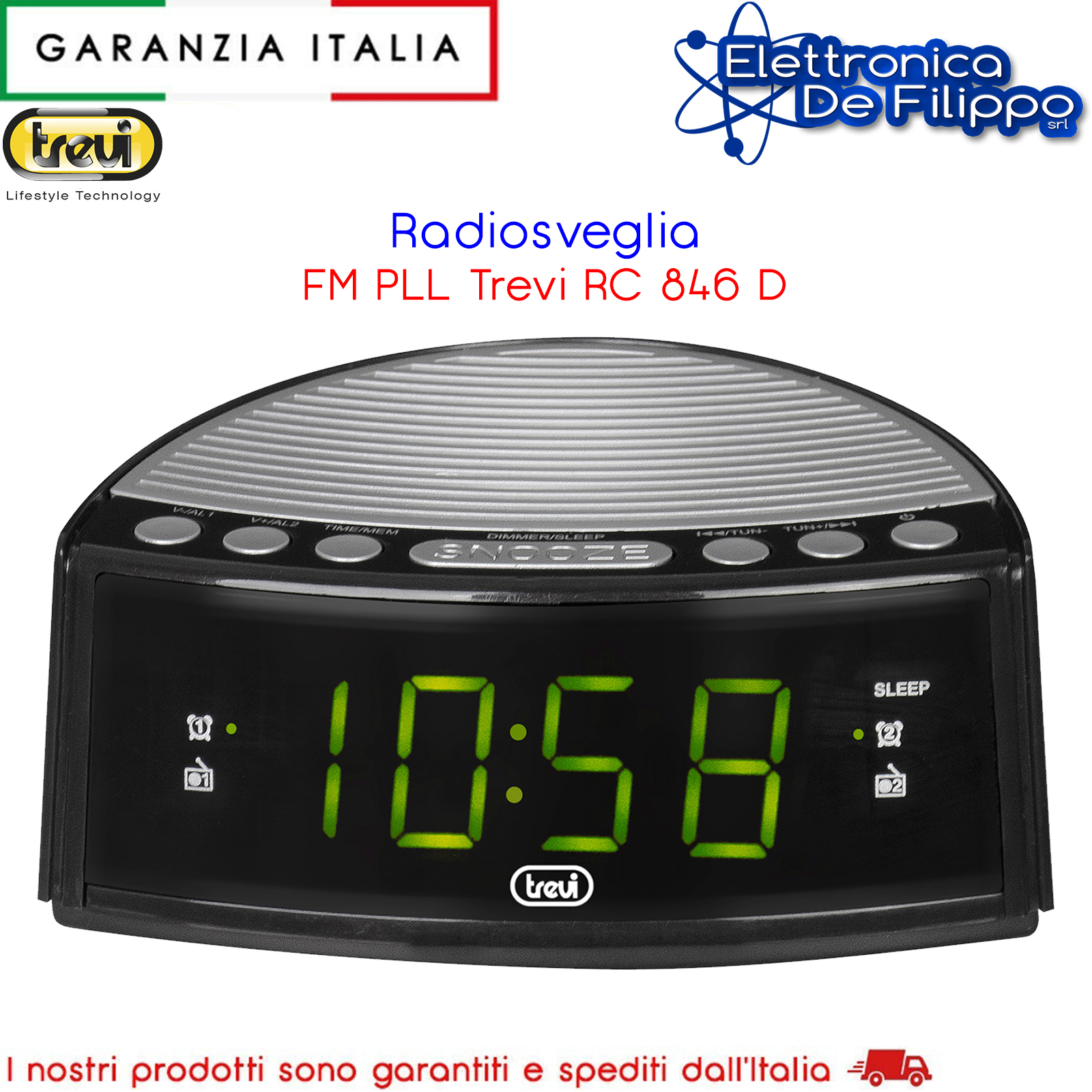 Trevi RC 846 D è la radiosveglia elettronica ideale per evitare spiacevoli ritardi ad appuntamenti, a scuola oppure al lavoro: ti basterà impostare una sveglia oppure tenere d’occhio l’orario visualizzato sul grande display a led verdi.