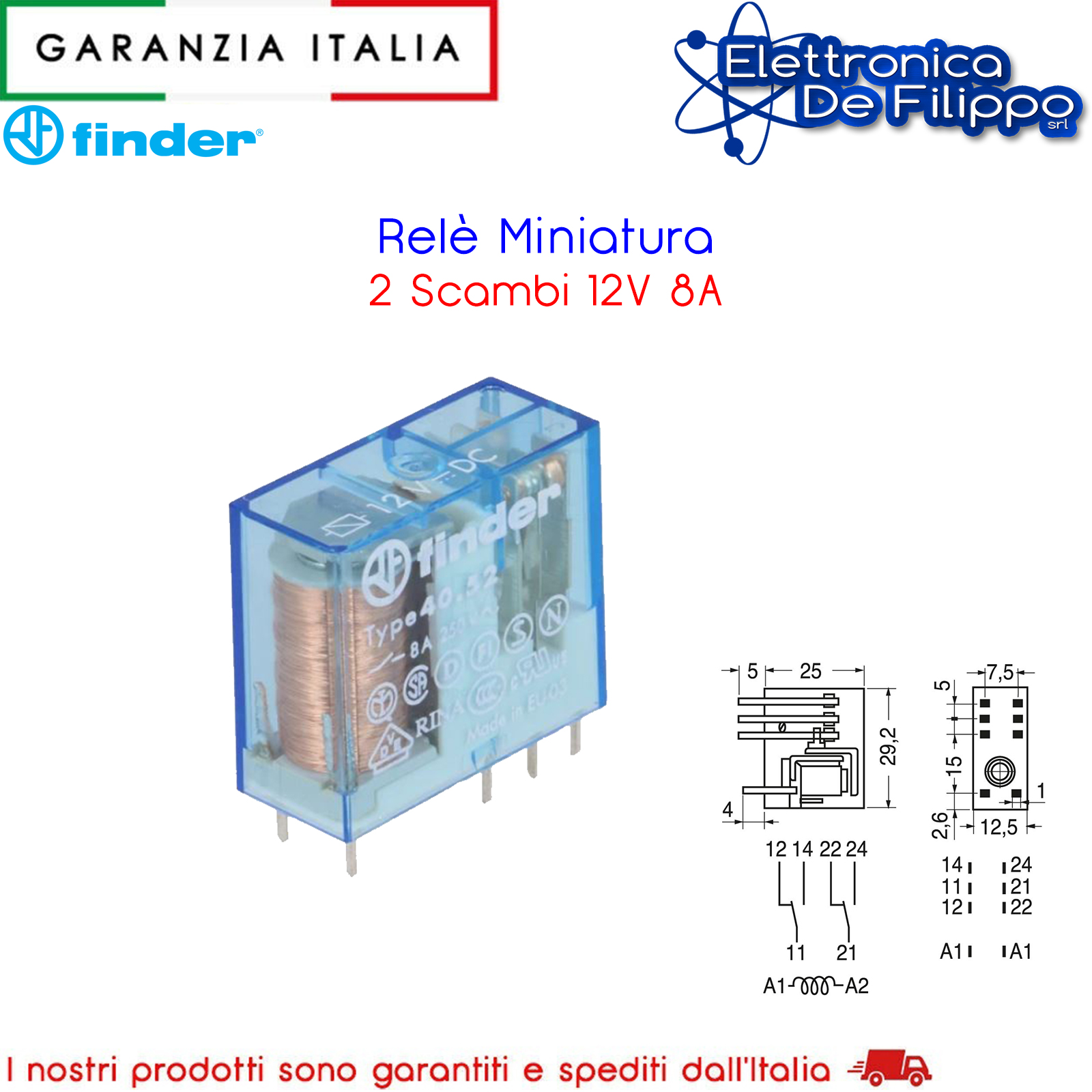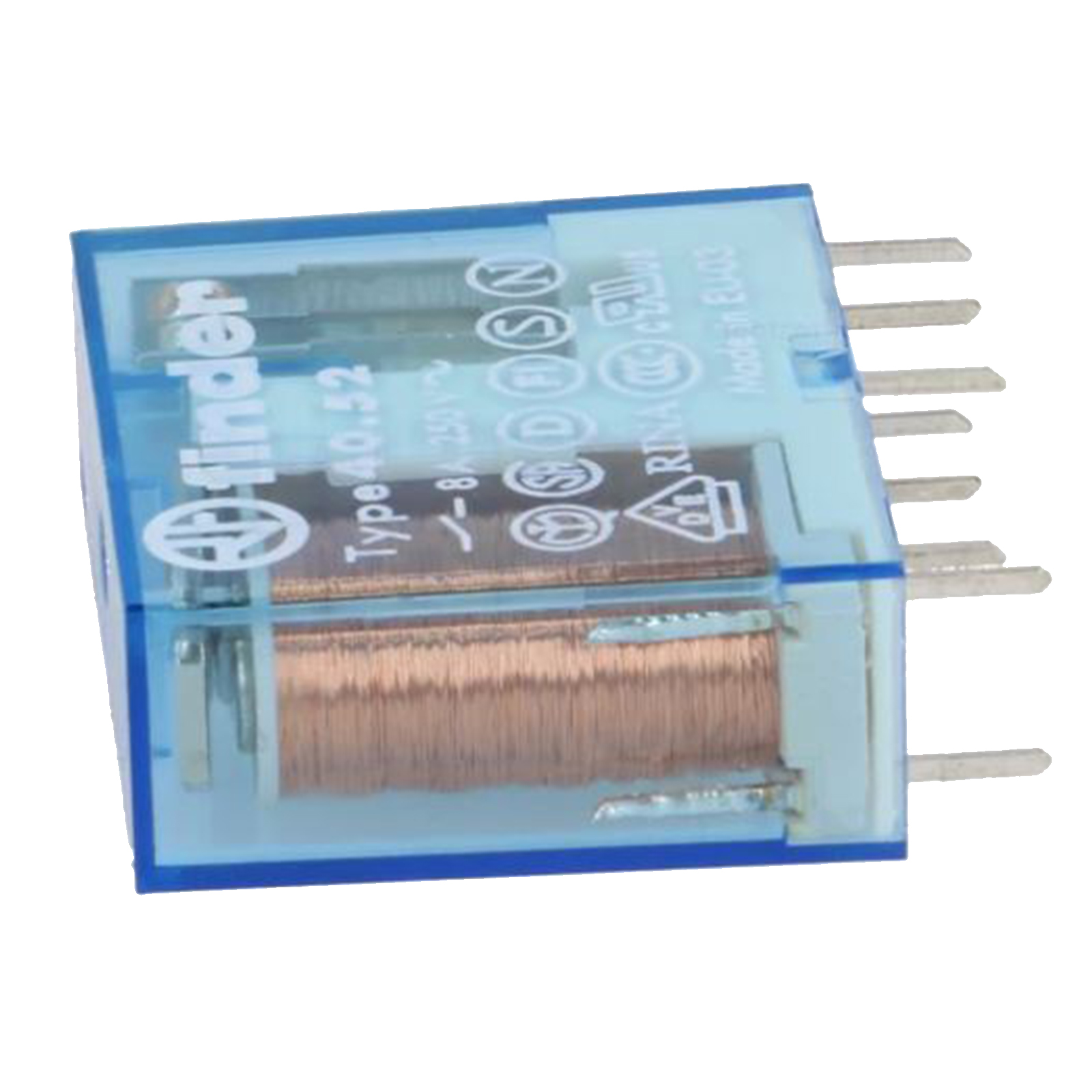 Il mini relè Tipo 40.52 è un relè per circuito stampato ed a innesto su zoccolo Serie 95. Dotato di 2 scambi 8 A su circuito stampato, passo 5.0 mm