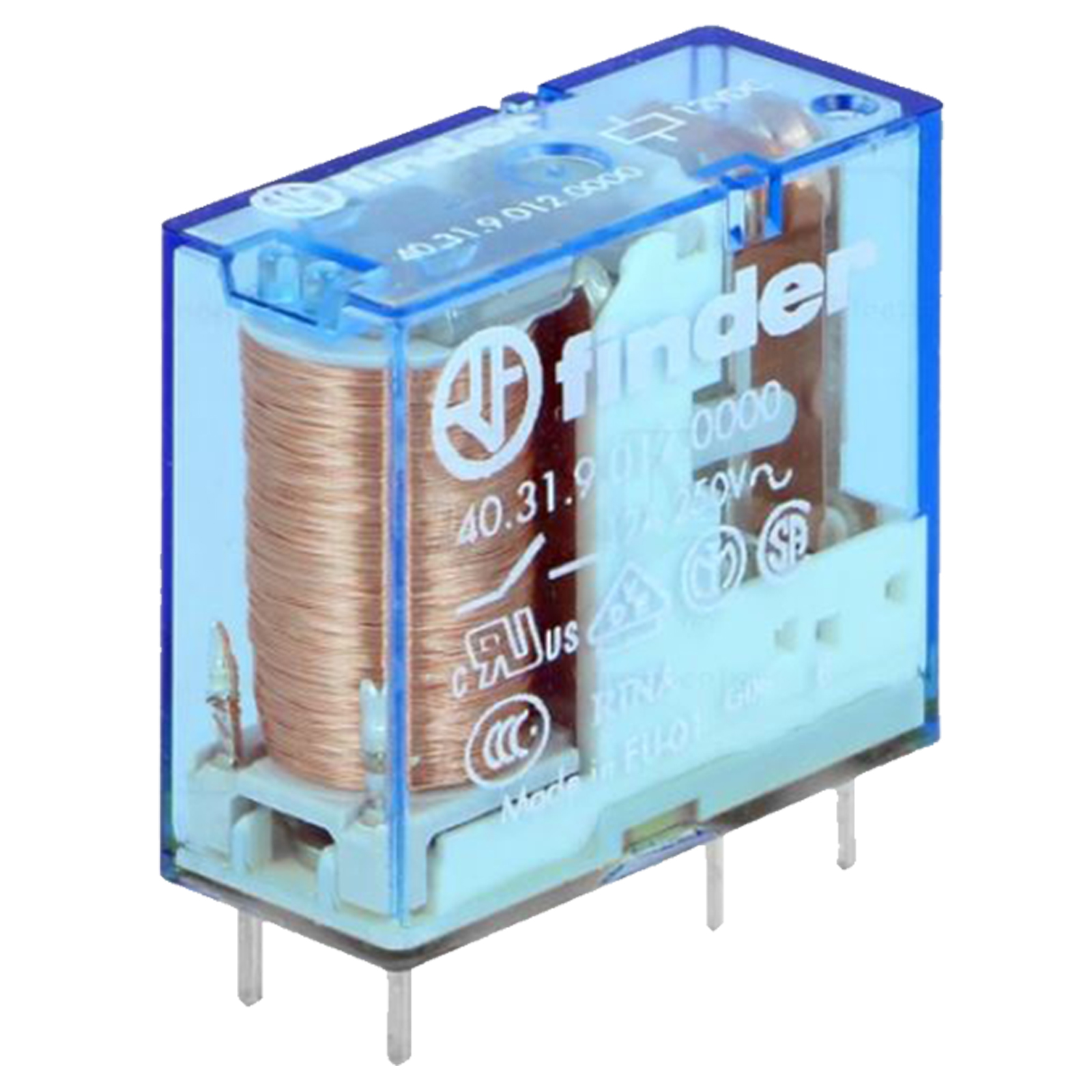Relè Miniatura Tipo 40.31 per circuito stampato ed a innesto su zoccolo Serie 95, 1 scambio 10 A su circuito stampato, con zoccolo 10 A, passo 5 mm.