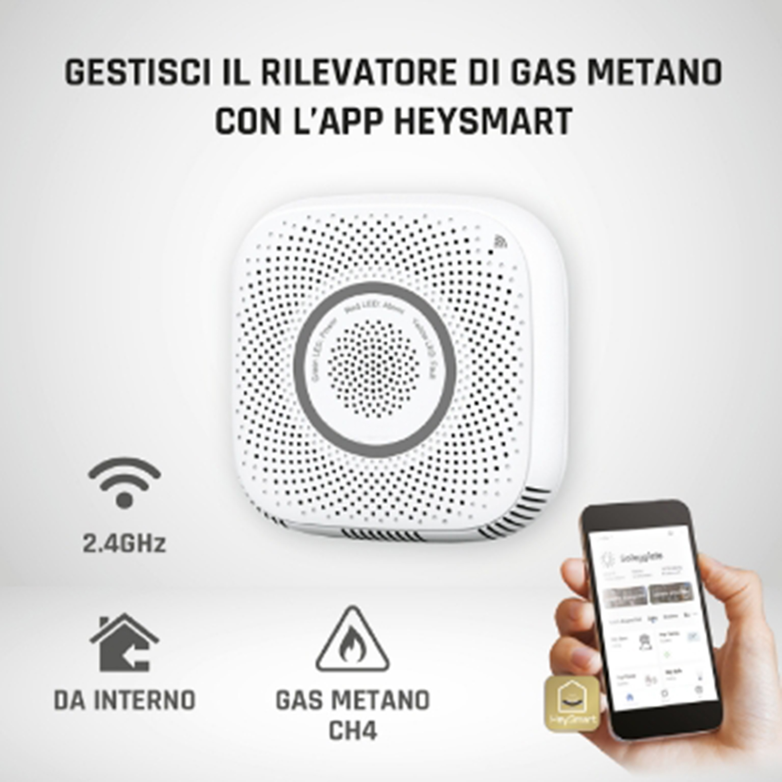 HEY GAS è un rilevatore di fughe di Gas Metano WIFI con segnalatore Ottico-Acustico e invio di notifiche Push, facile da installare: basta inserirlo in una presa di corrente. Il sensore ad alta sensibilità integrato, rilevata una concentrazione di gas pericolosa, attiva l’avvisatore acustico interno ed invia notifiche push all’App Hey Smart dell'utente. Il dispositivo è anche in grado di attivare l’uscita Ausiliaria, fornendo una tensione di 11 - 13V per la gestione di una valvola (opzionale), bloccando così l’erogazione di gas. L'uscita Ausiliaria può essere monitorata e gestita anche da remoto tramite App HEY SMART. Facile quindi intervenire in aiuto ai nostri cari o a persone anziane.