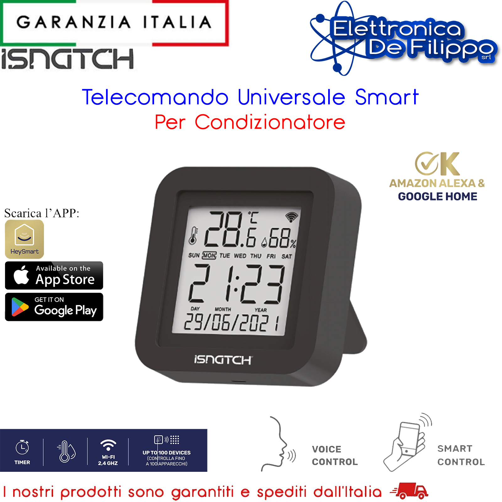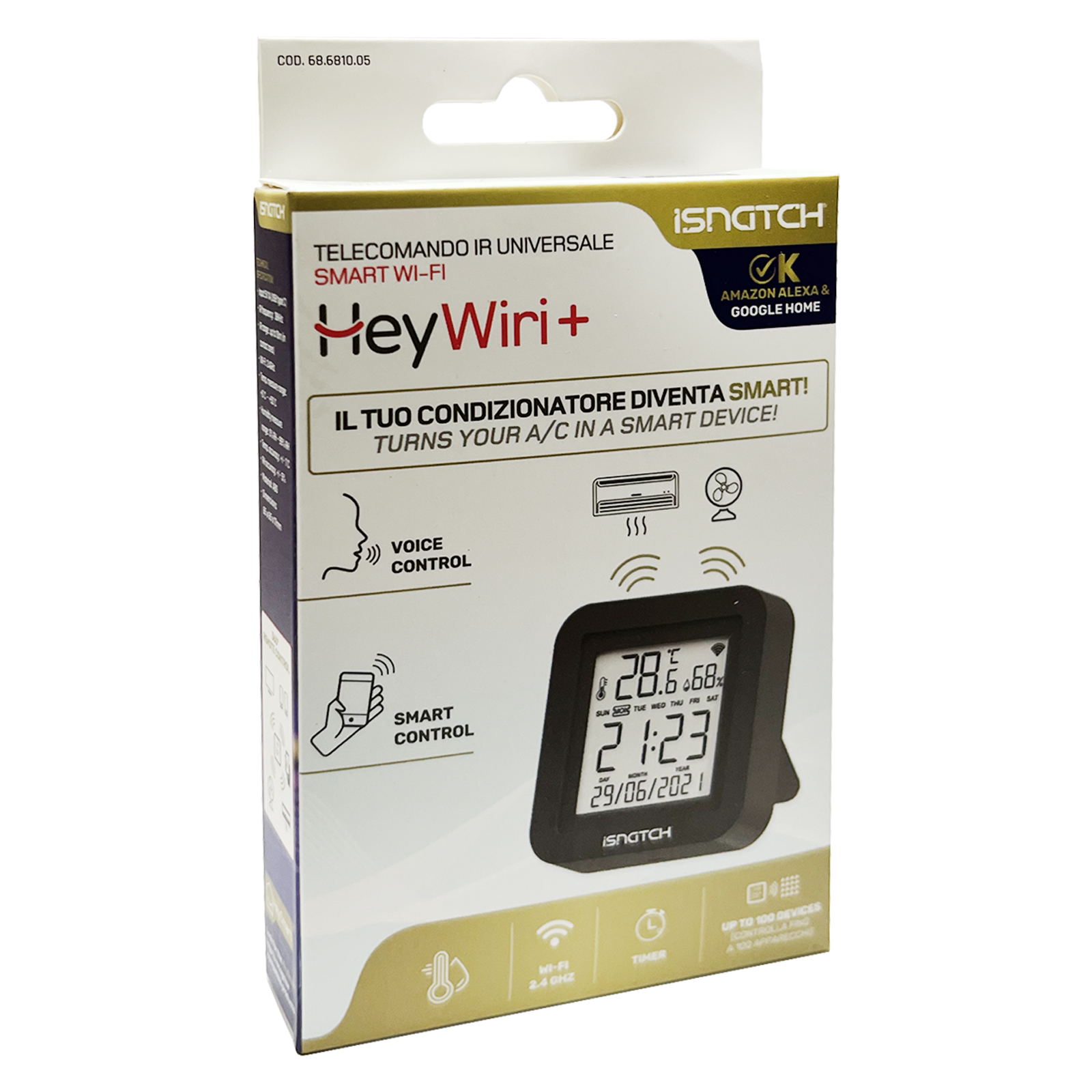 Telecomando InfraRossi universale con display per il monitoraggio di temperatura e umidità. Replica il telecomando del tuo condizionatore o qualsiasi apparecchio infrarossi e lo fa diventare SMART! Gestisci accensioni, spegnimento e variazioni direttamente da App HeySmart o con la tua voce. Integralo in pratici scenari domotici per la tua routine quotidiana. HeyWiri+ è anche compatibile con gli assistenti vocali Amazon Alexa e Google Home.