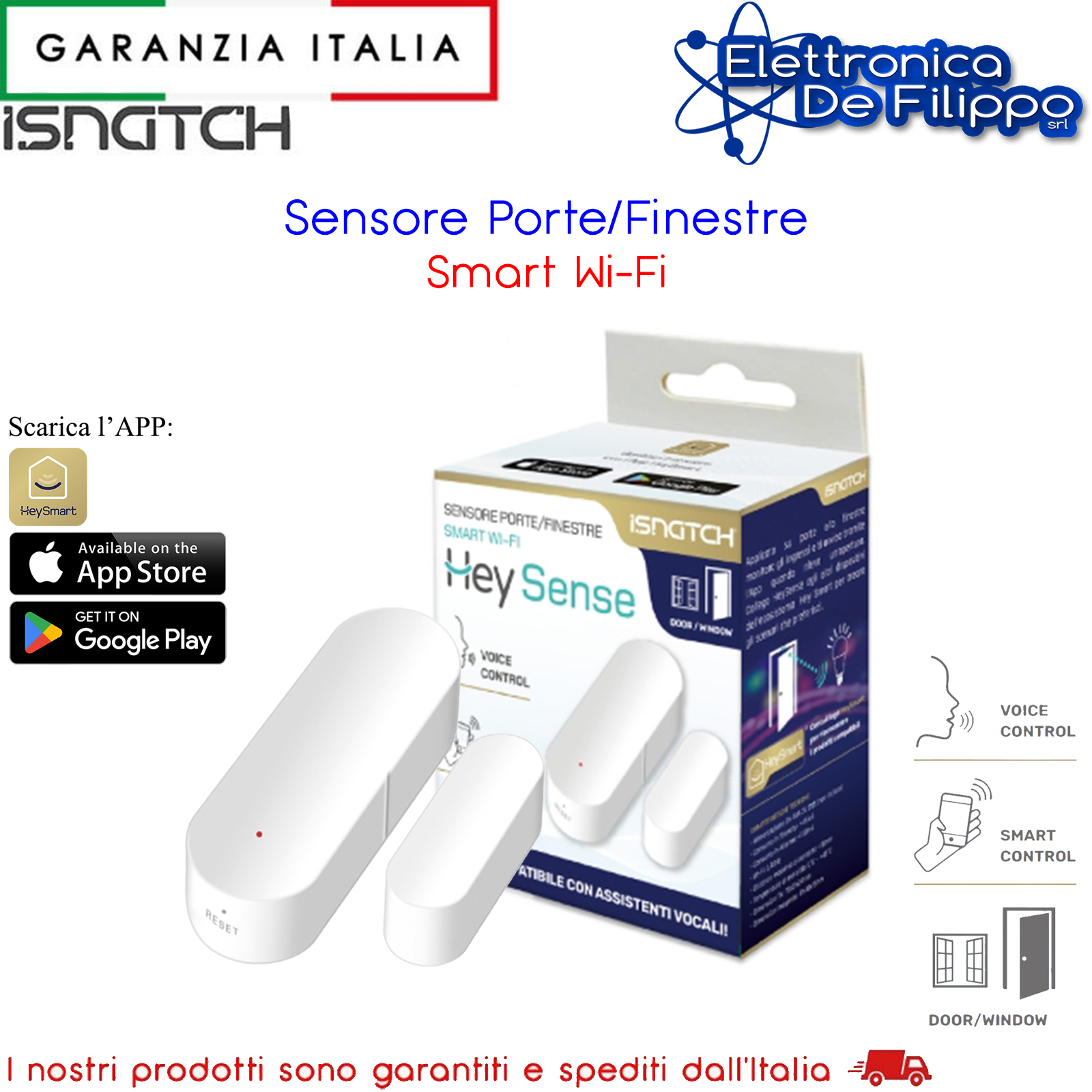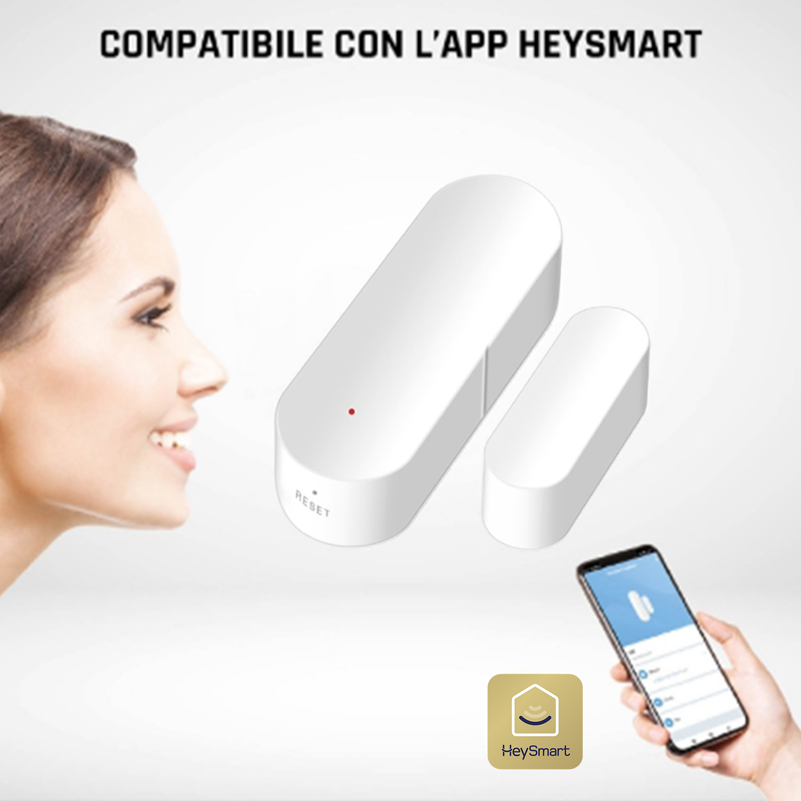 Sensore magnetico di contatto smart wi-fi. Applicato su porte e/o finestre monitora gli ingressi e le chiusure e ti avvisa tramite notifica push su app HeySmart.Le notifiche sono programmabili tramite App: solo apertura, solo chiusura, batteria scarica, apertura e chiusura.HeySense è utile anche per il collegamento con altri dispositivi in modo da creare automazioni smart come l'accesione di una luce all'apertura/chiusura di una porta.