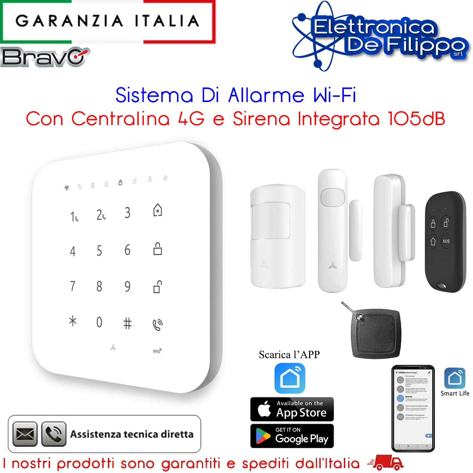 Sistema di allarme Wi-Fi con centralina 4G e sirena integrata (105 dB) Tecnologia FHSS con variazione di frequenza di trasmissione che consente un maggiore grado di sicurezza della trasmissione/comunicazione e la protezione contro possibili interferenze con altri dispositivi a radiofrequenza Applicazione Smart Life per iOS e Android in Italiano Possibilità di ricezione di avvisi tramite notifi che push, SMS e chiamate Modalità di utilizzo: ARM: attivazione di tutti i sensori - HOME: attivazione solo dei sensori perimetrali - SOS: attivazione immediata della sirena Possibilità di aggiungere fi no a 50 Sensori, 10 Telecomandi e 30 RFID
