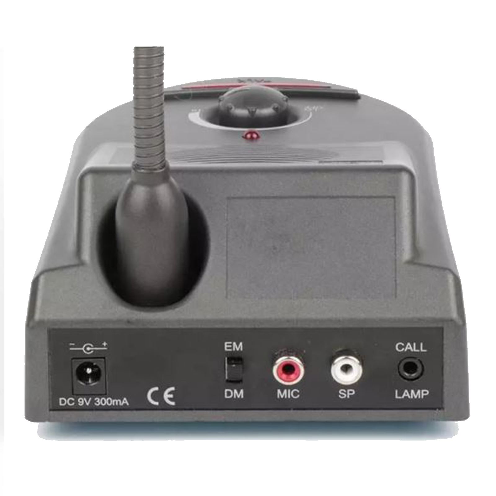 Consigliato per sportelli, vigilantes di banca, vendita con vetro blindato per atti vandalici, reception, ticket, ecc. Composto da microfono da tavolo a collo di cigno 300mm staccabile con contatto XLR e da un altoparlante separato con microfono integrato e tasto di chiamata. Capsula electret, a cardioide. Altoparlante con cavo 3 metri. Regolazione volume.