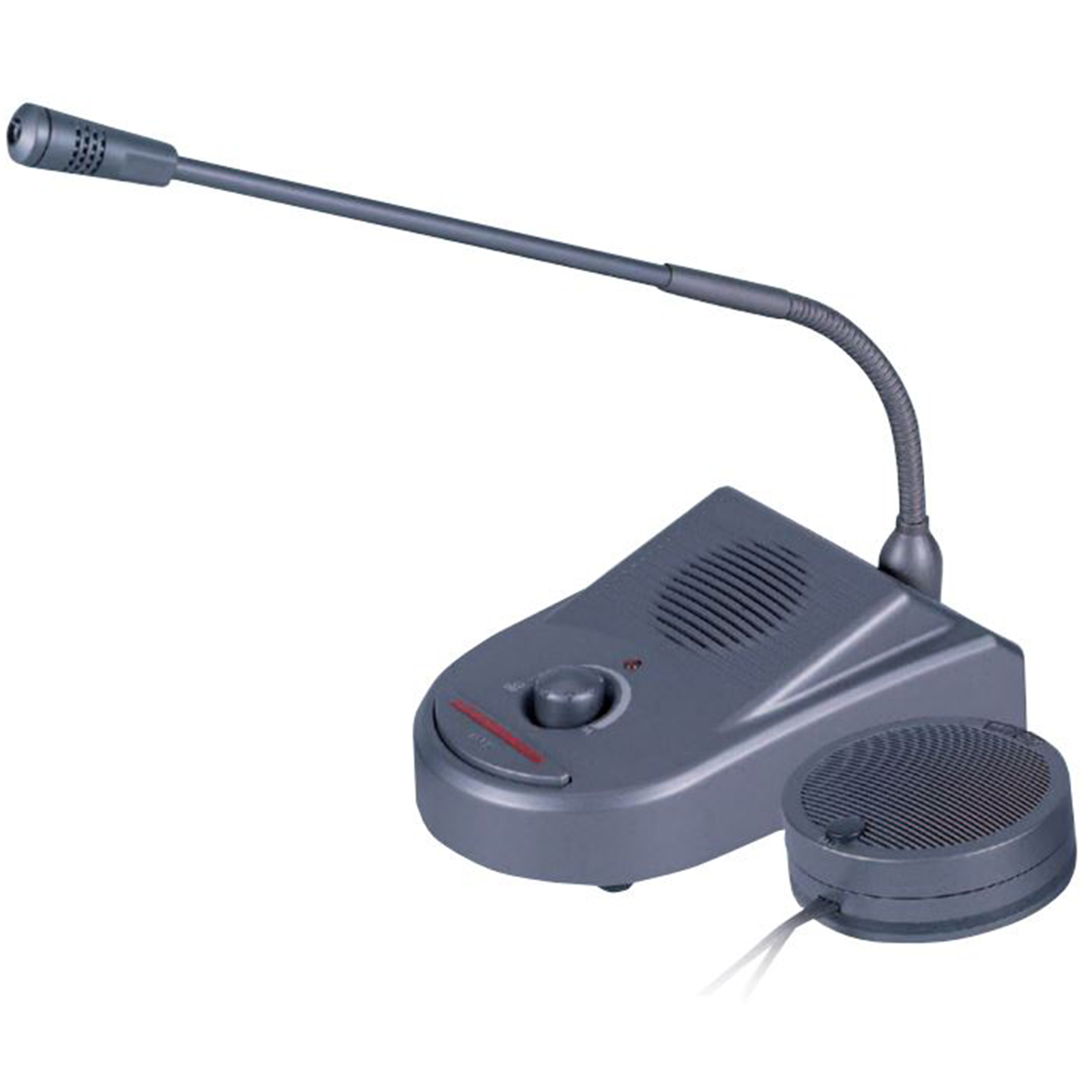 Consigliato per sportelli, vigilantes di banca, vendita con vetro blindato per atti vandalici, reception, ticket, ecc. Composto da microfono da tavolo a collo di cigno 300mm staccabile con contatto XLR e da un altoparlante separato con microfono integrato e tasto di chiamata. Capsula electret, a cardioide. Altoparlante con cavo 3 metri. Regolazione volume.