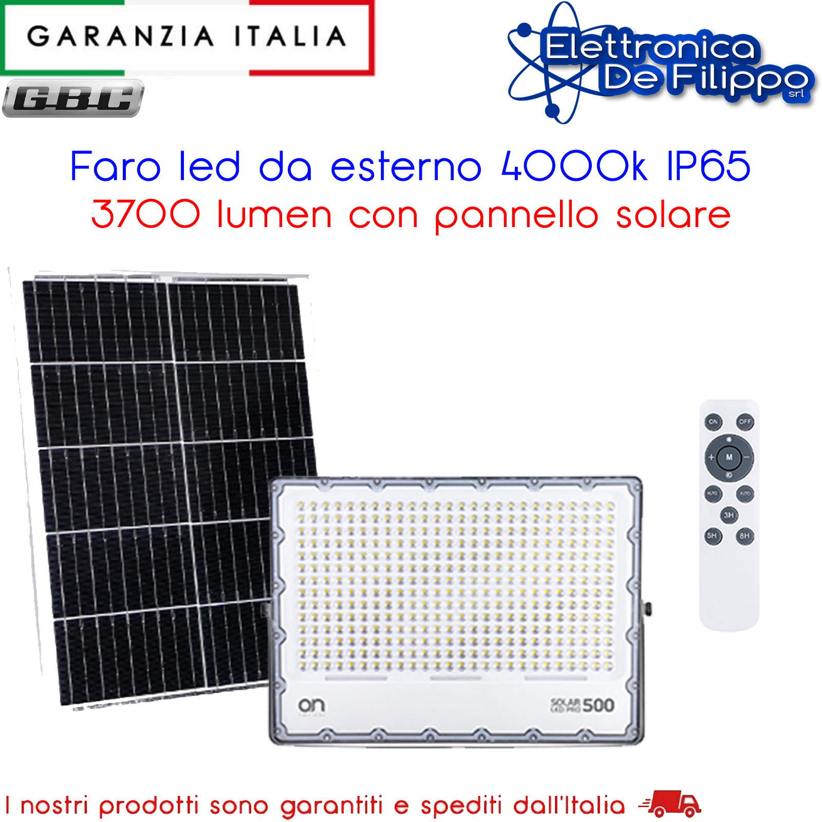 Sistema per illuminazione LED a batteria con ricarica solare di elevata qualità, composto da un pannello fotovoltaico monocristallino con staffa per installazione a parete, da un faro per esterno con design moderno e di ridotto spessore, che integra una batteria ricaricabile ad elevate prestazioni e da un telecomando per il controllo e la gestione delle funzionalità manuali e programmate. Accensione del faro consentita in modalità automatica al calar della luce diurna.