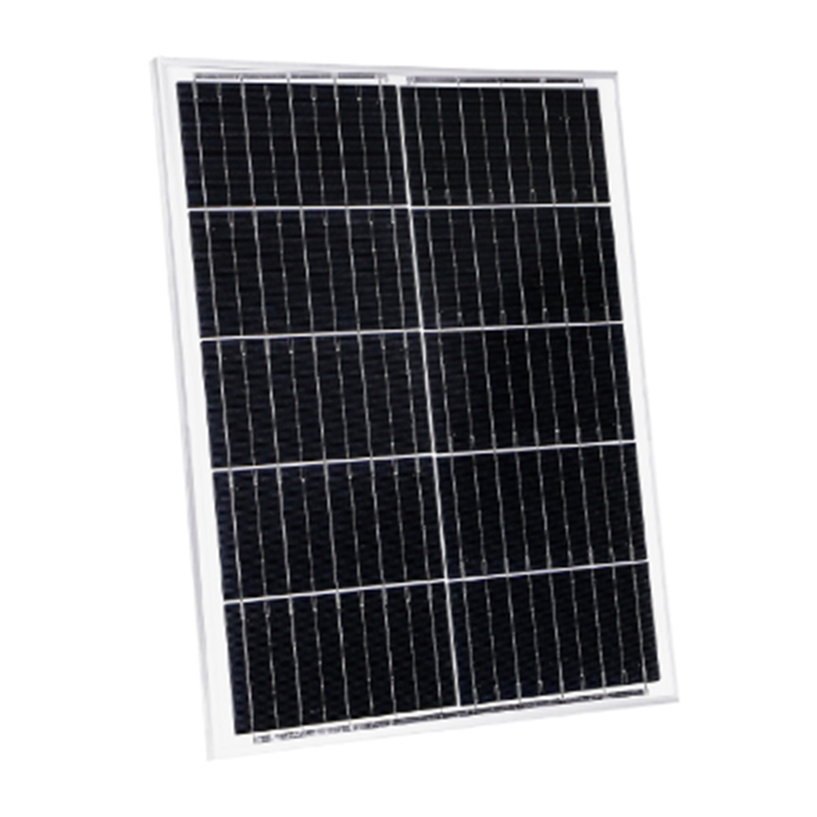 Sistema per illuminazione LED a batteria con ricarica solare di elevata qualità, composto da un pannello fotovoltaico monocristallino con staffa per installazione a parete, da un faro per esterno con design moderno e di ridotto spessore, che integra una batteria ricaricabile ad elevate prestazioni e da un telecomando per il controllo e la gestione delle funzionalità manuali e programmate. Accensione del faro consentita in modalità automatica al calar della luce diurna.