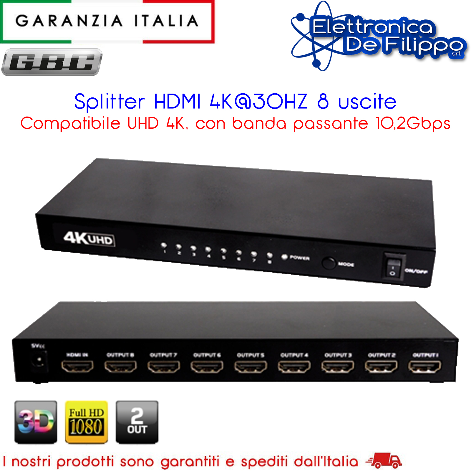 Collega una sorgente 4K@30Hz e visualizza contemporaneamente su 8 TV 4K. Compatibile UHD 4K, con banda passante 10,2Gbps. Alimentazione 5V 1A inclusa