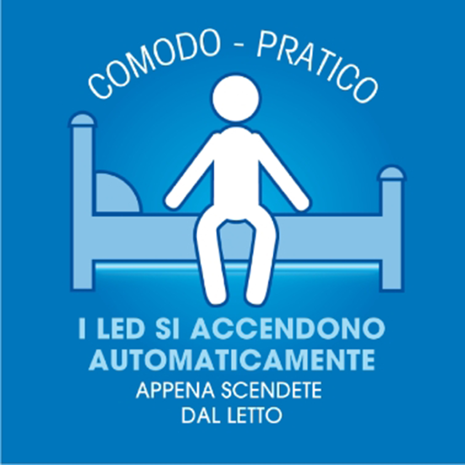 Le due strisce da letto matrimoniale si accendono automaticamente con l’attivazione dei 2 sensori di presenza in dotazione in modo da segnare facilmente il percorso durante la notte. È possibile programmare la temporizzazione da 30 sec. a 6min. Lunghezza 1,5m x 2 strisce, Flusso luminoso totale 600 Lumen , Potenza totale 6W (3Wx2), Numero totale di Led 36.