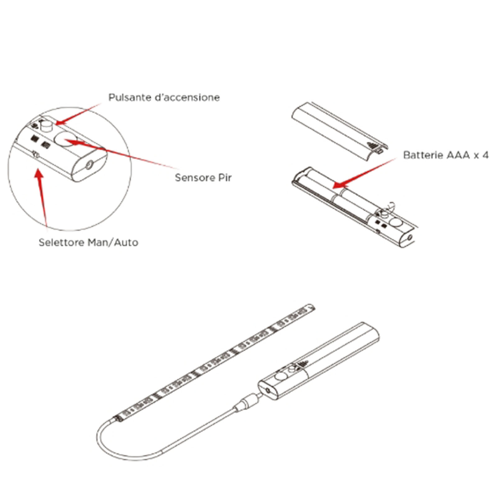 Striscia IP65 con 30 led SMD 2835. Ideale per armadi, sottoscala, sotto letto, balconi. Alimentata a batterie (non fornite) per la massima flessibilità di installazione. Sensore PIR in dotazione. È possibile selezionare la funzione manuale o automatica con sensore attraverso l'apposito switch presente sul controller.